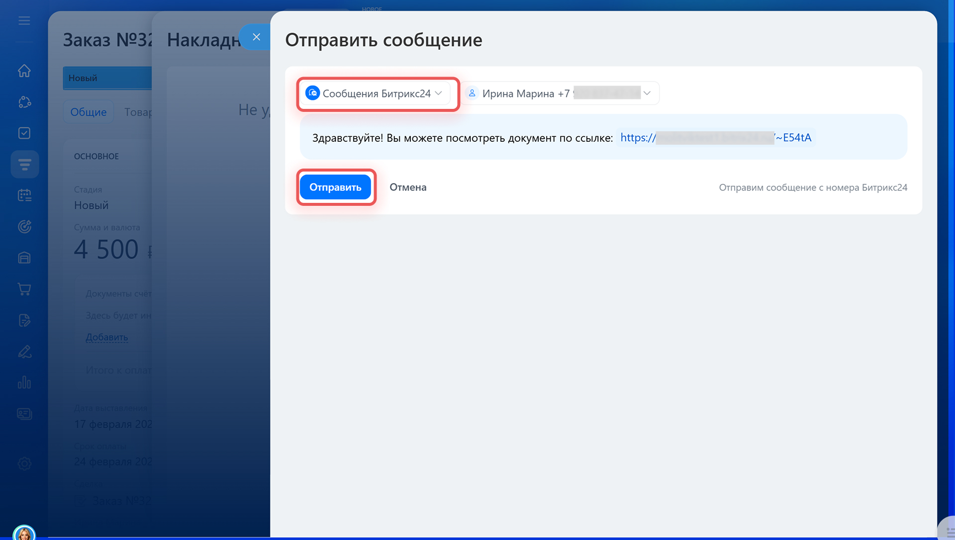 2–3. Выберите вариант Сообщения Битрикс24 и нажмите Отправить. Клиент получит СМС с ссылкой на документ и сможет с ним ознакомиться.
