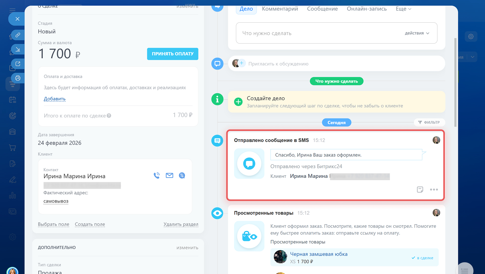 Сервис позволяет отправлять клиентам автоматические шаблонные сообщения, например, со статусом заказа или ссылкой на оплату. Когда клиент получит СМС, он сможет открыть ссылку и выполнить действие: оплатить заказ или посмотреть документ. Информация о сообщении — текст, время отправки, статус СМС — отобразятся в таймлайне карточки CRM.