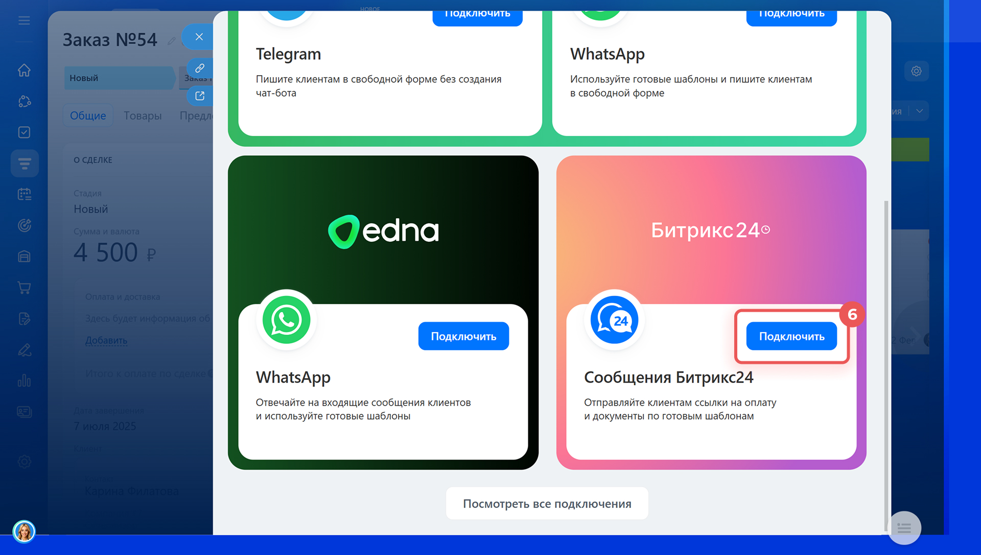6. Выберите Сообщения Битрикс24 и нажмите Подключить. Откроется слайдер.