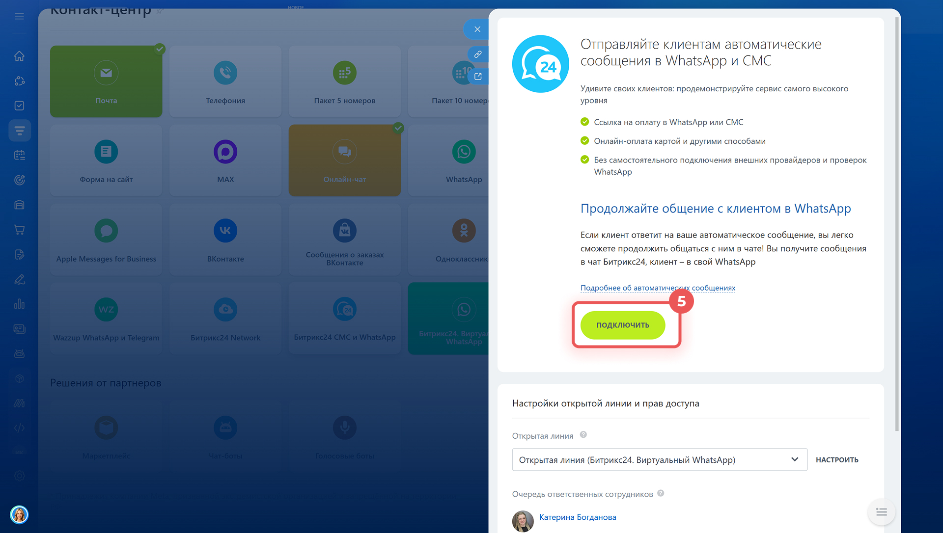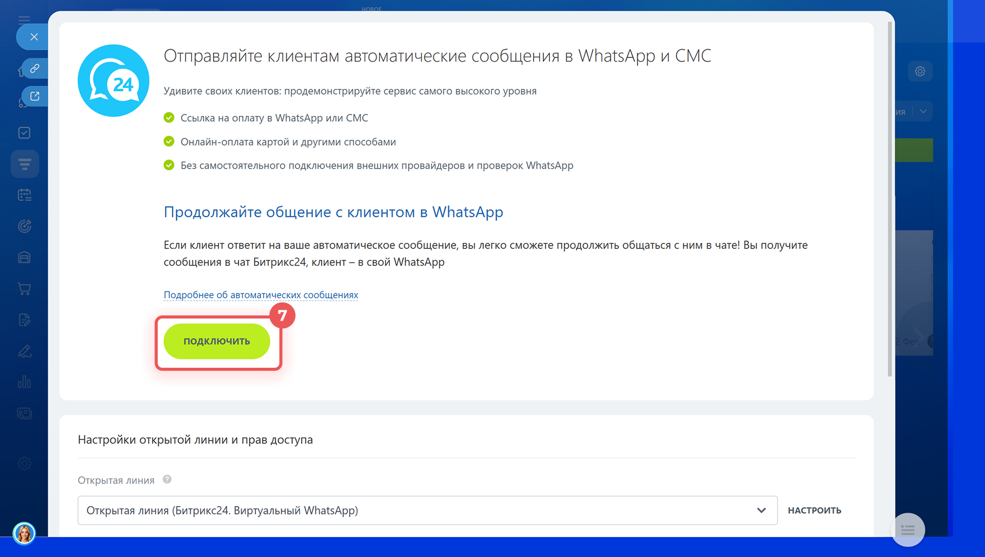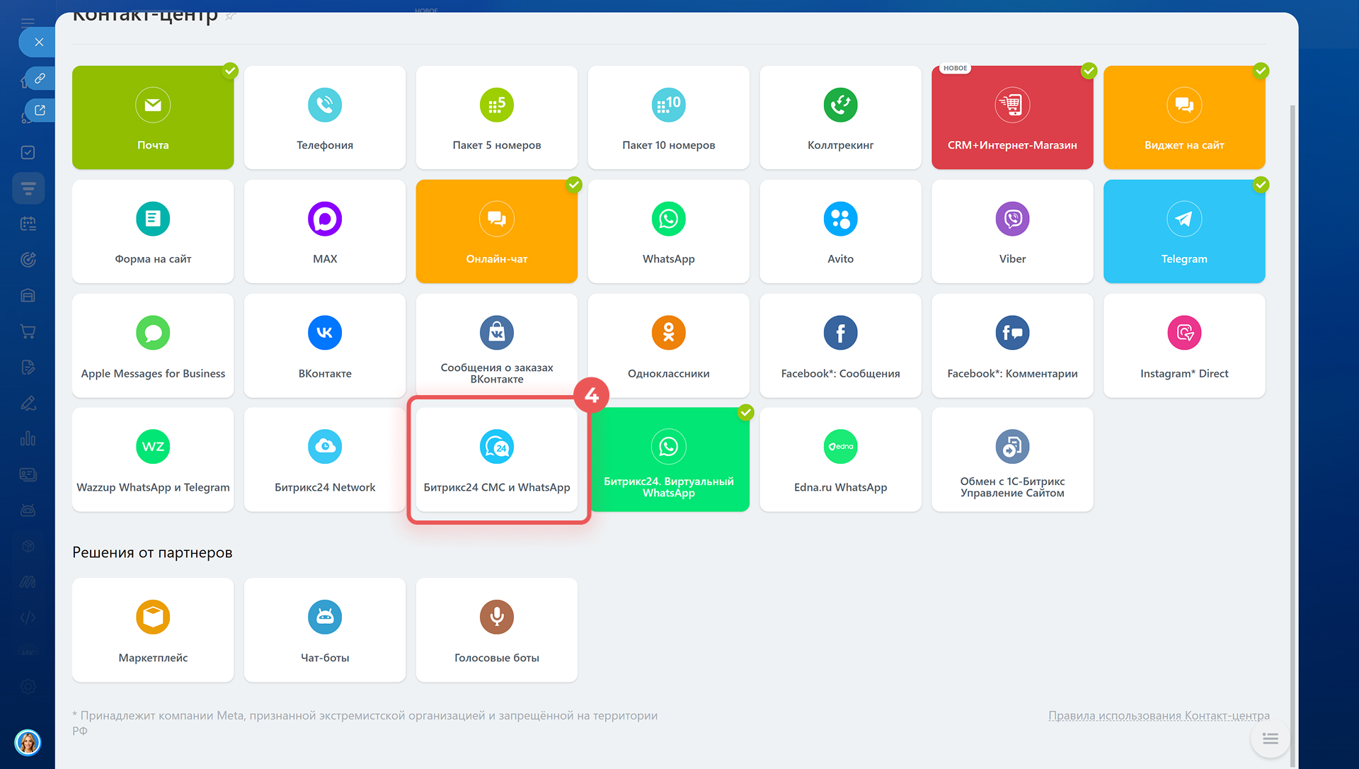 4. Нажмите Битрикс24 СМС и WhatsApp* — откроется слайдер.