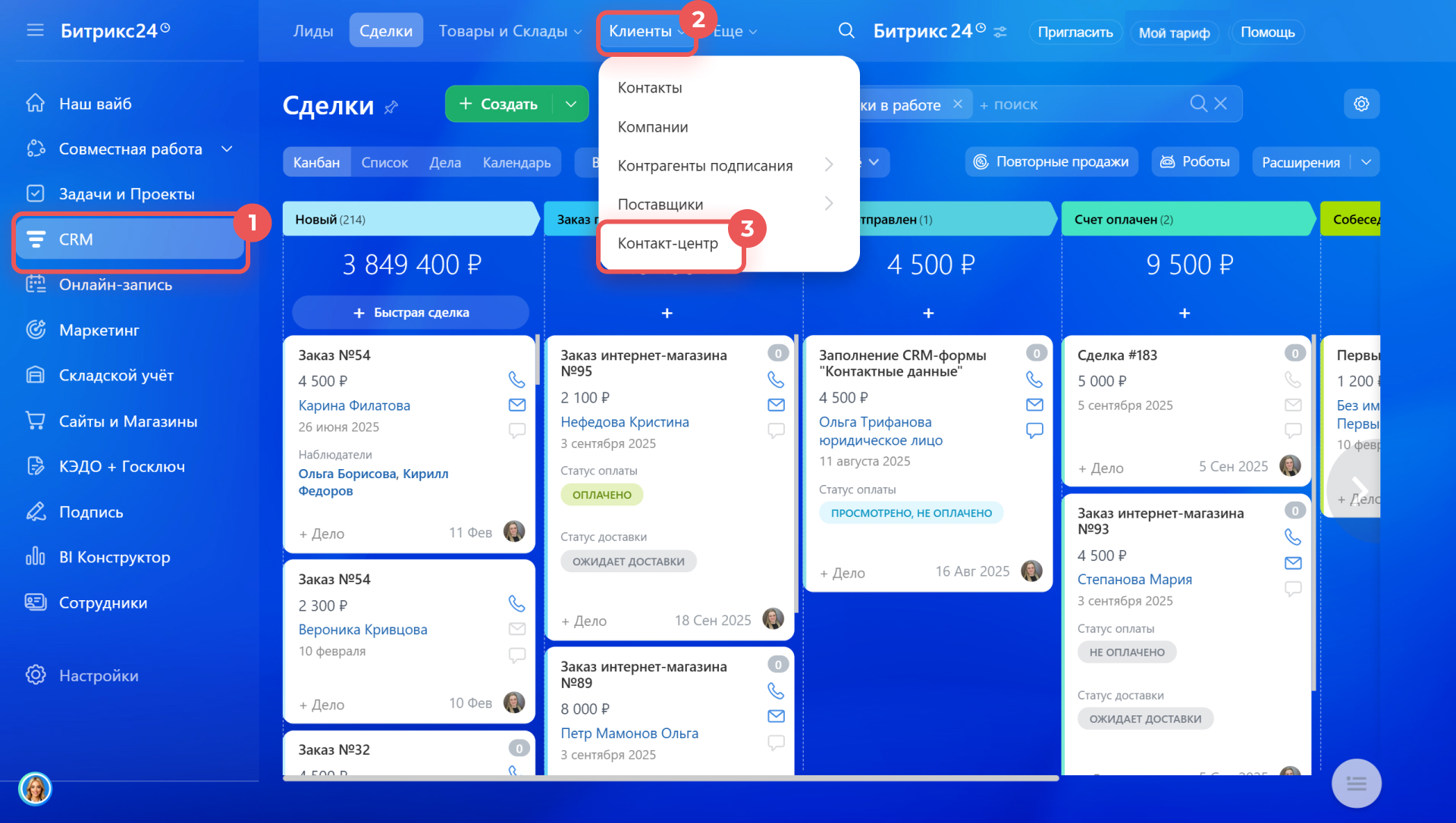 1–3. Перейдите в CRM > Клиенты > Контакт-центр.