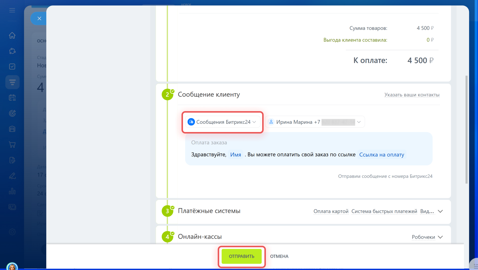 2–3. В блоке Сообщение клиенту выберите вариант Сообщения Битрикс24 и нажмите Отправить. Клиент получит СМС с ссылкой и сможет оплатить заказ.