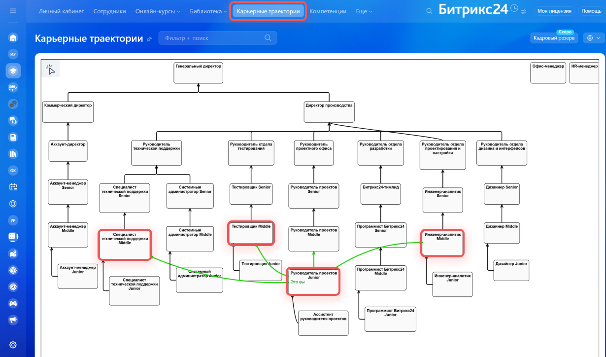 Программа доступна, если у пользователя есть привязка к должности и выстроены карьерные траектории в административной части портала.