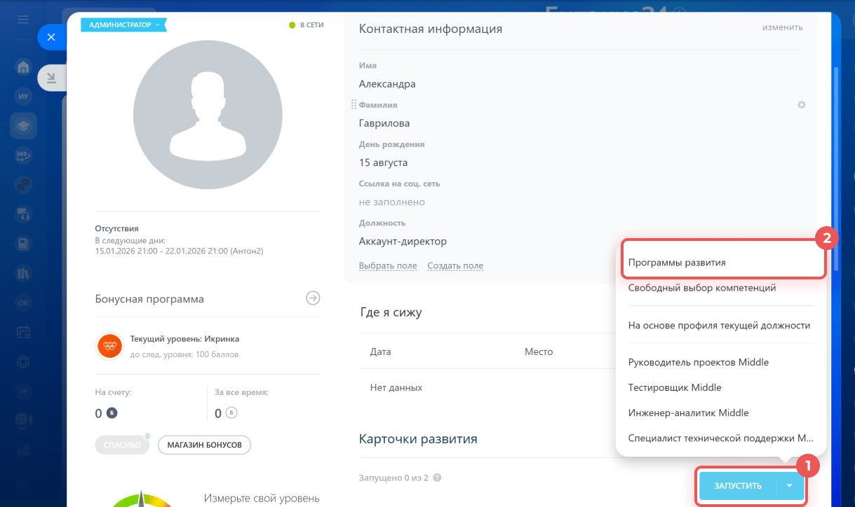 Чтобы запустить программу развития, перейдите в профиль сотрудника, нажмите кнопку Запустить и выберите нужную программу.