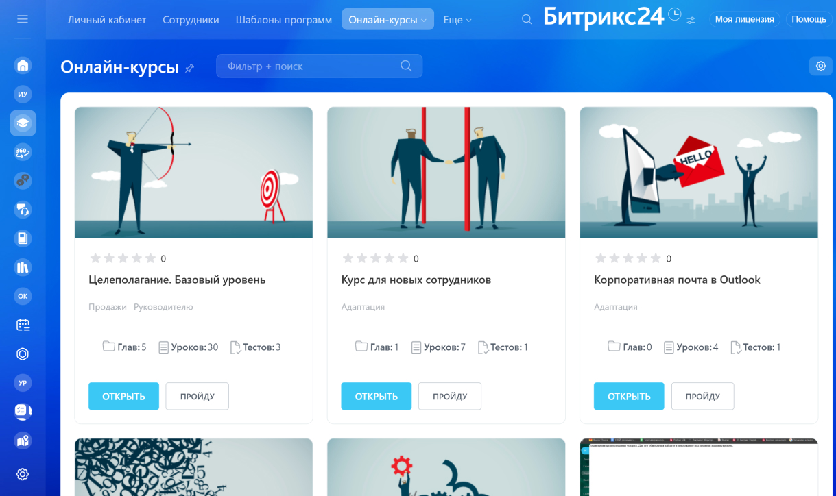 В Битрикс24 можно создавать онлайн-курсы, добавлять в них тесты для проверки знаний и отслеживать результаты прохождения.