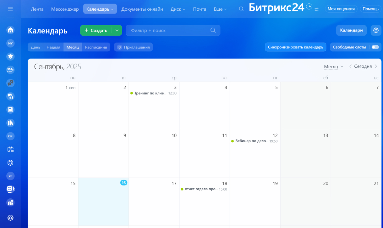 Например, запланируйте тренинг по клиентоориентированности и расскажите о стандартах работы с клиентами. Узнали, что будет проходить интересный вебинар — расскажите о мероприятии, добавьте в календарь и коллеги тоже смогут посетить его.