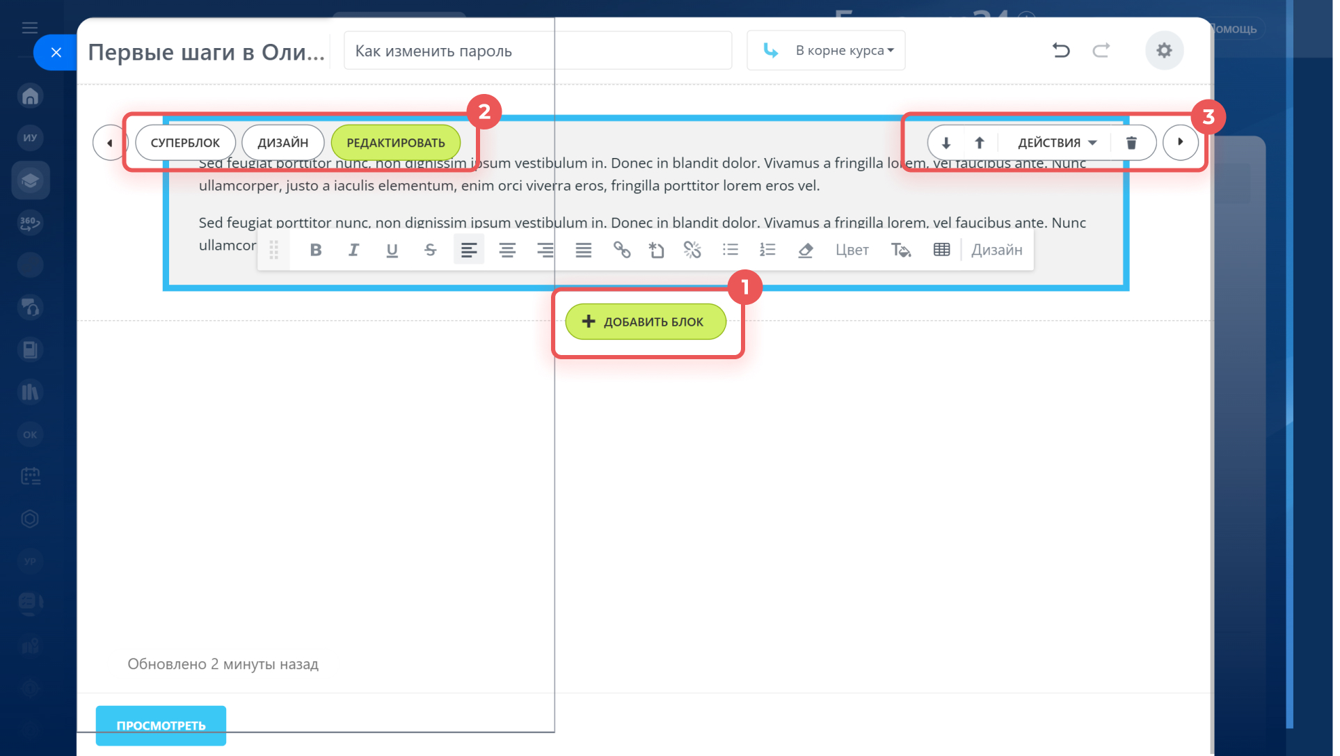 Откроется редактор сайтов. С помощью готовых блоков наполните урок контентом. Нажмите Добавить блок и выберите из списка подходящий. Измените его под свои задачи.