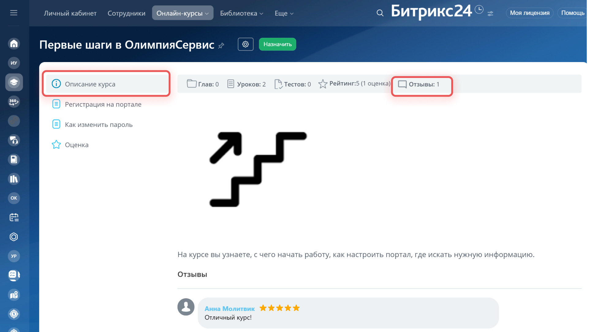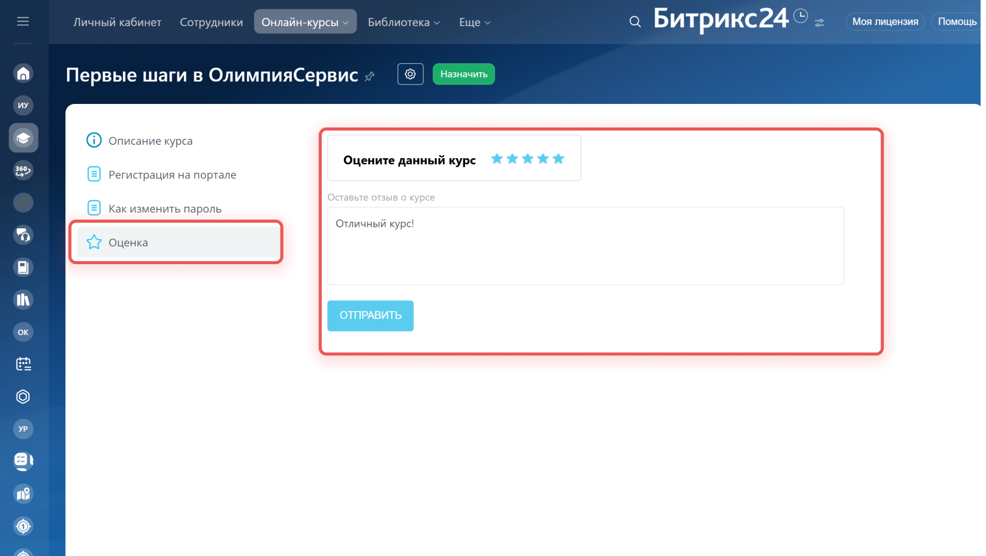 В онлайн-курсах рейтинг стоит по умолчанию и находится в меню Оценка. Здесь сотрудник может Оценить данный курс и Оставить отзыв о курсе.