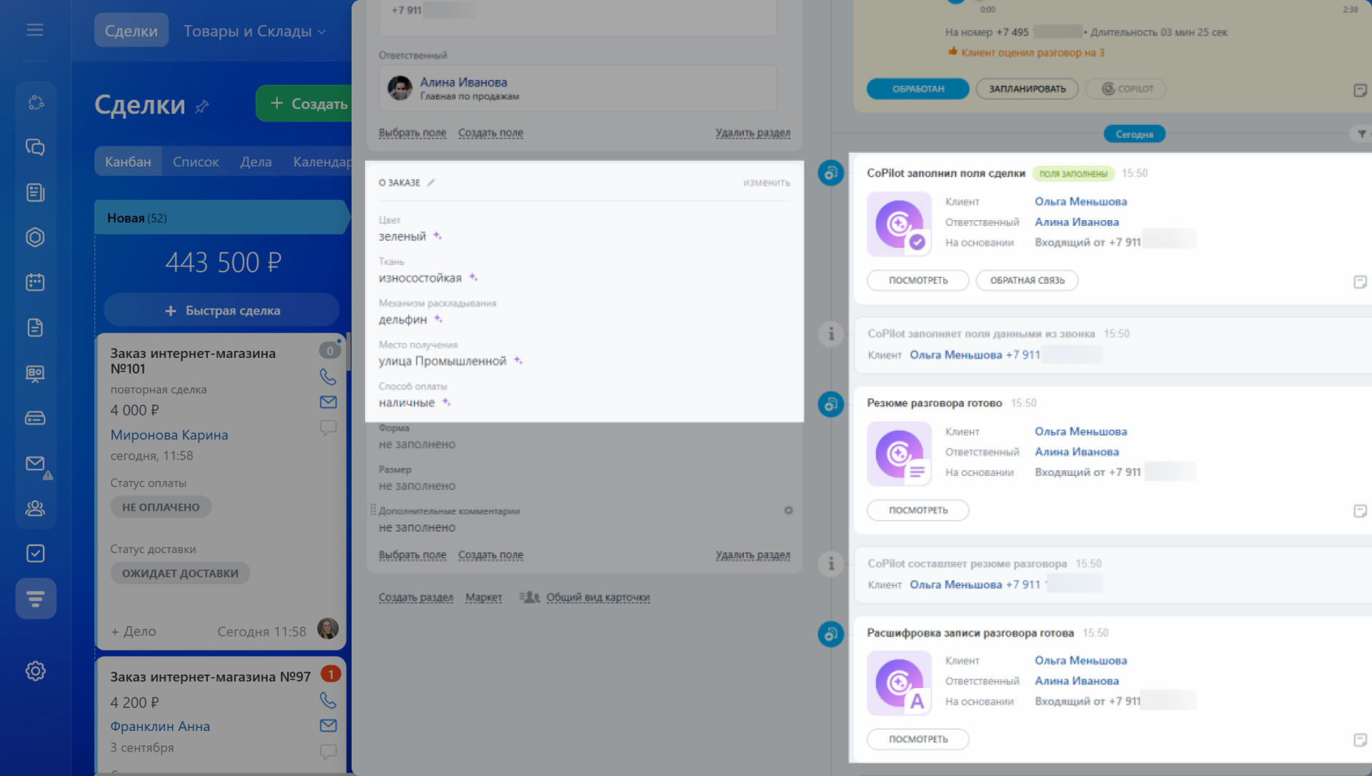 - После разговора CoPilot сам заполнит поля в карточке CRM данными из звонка.