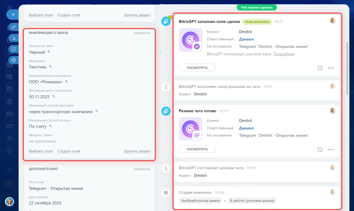 BitrixGPT в CRM: анализ чатов и заполнение карточки