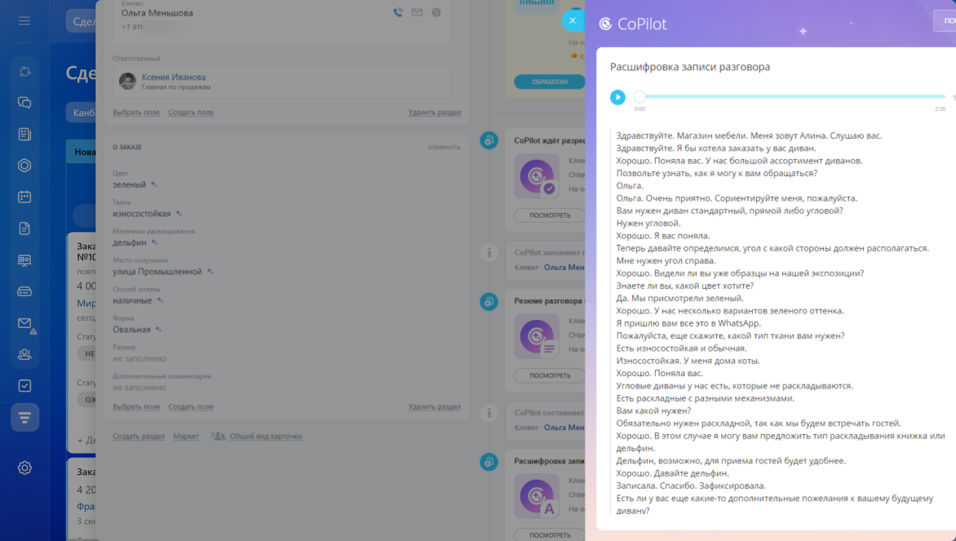 Расшифровка записи звонка. CoPilot расшифрует запись разговора с клиентом и переведет ее в текст. Менеджер может не тратить время на прослушивание звонка, а сразу открыть расшифровку и посмотреть все детали разговора. Поиск по тексту поможет быстро найти нужную информацию.