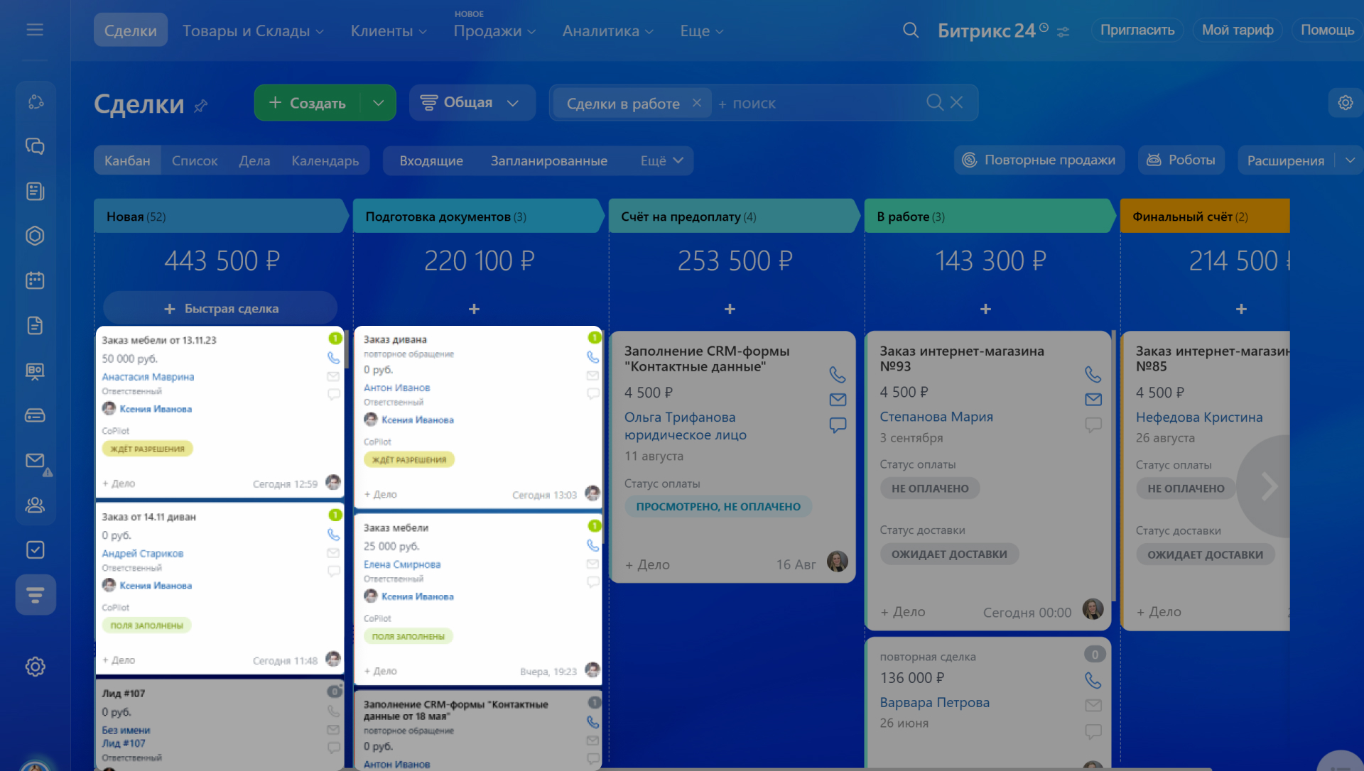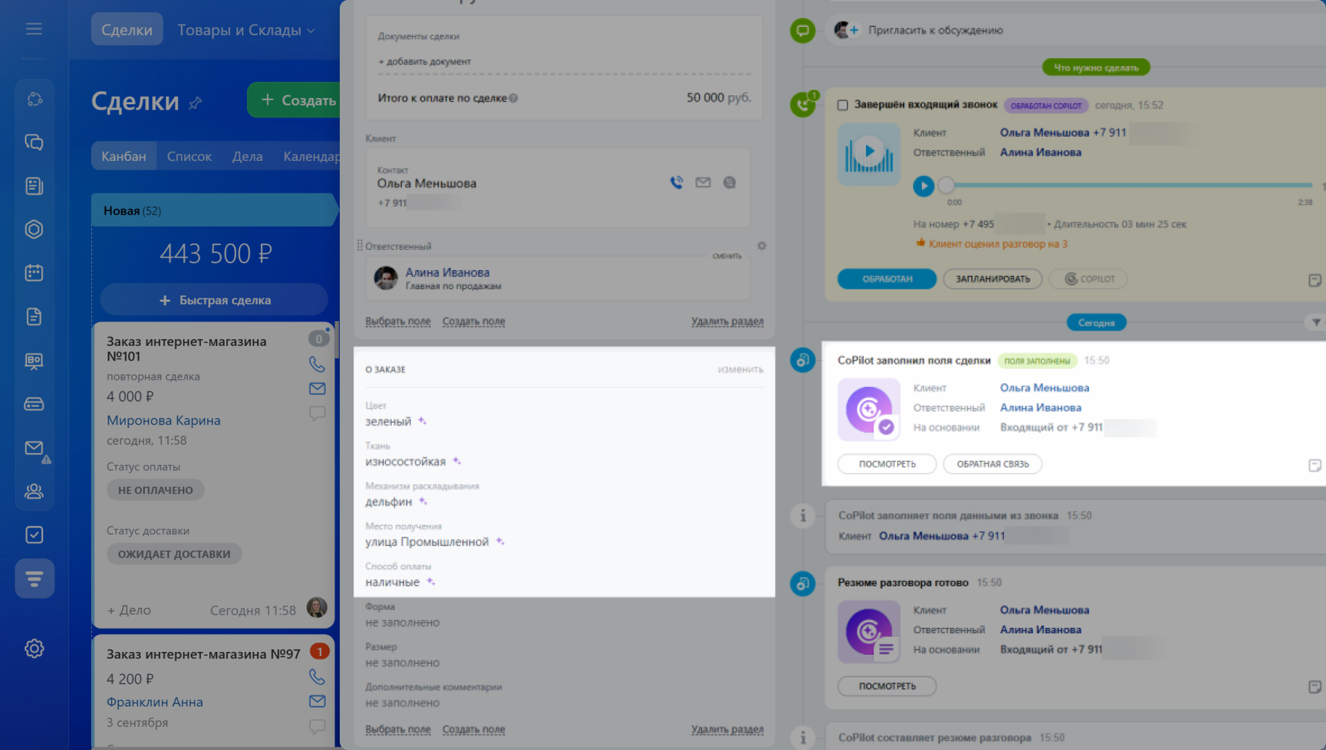 - Поля заполнены — CoPilot автоматически заполнил поля, можно дальше работать со сделкой.