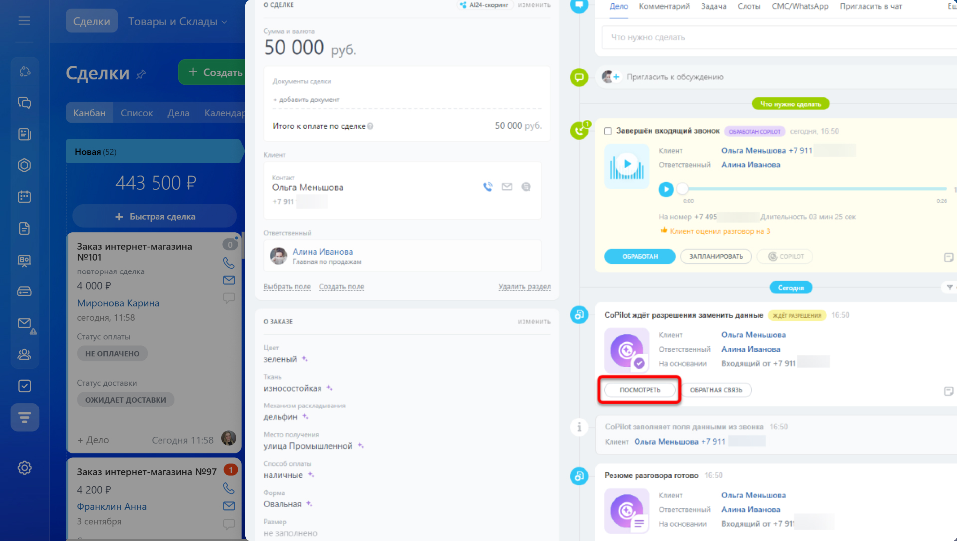 Например, клиент перезвонил, чтобы изменить адрес доставки. CoPilot обработает звонок и предложит записать в поле новый адрес. В таймлайне вы увидите статус «CoPilot ждет разрешения заменить данные». Нажмите Посмотреть, чтобы увидеть и подтвердить замену.