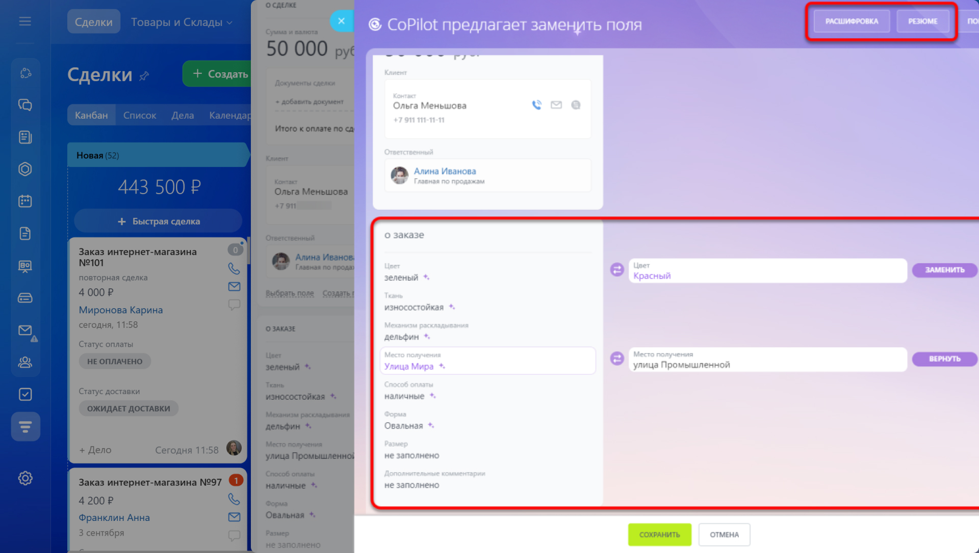 - CoPilot автоматически заполнит пустые поля в карточке CRM данными из звонка. Если в полях уже есть информация, вы сможете выбрать — заменить или оставить ее.