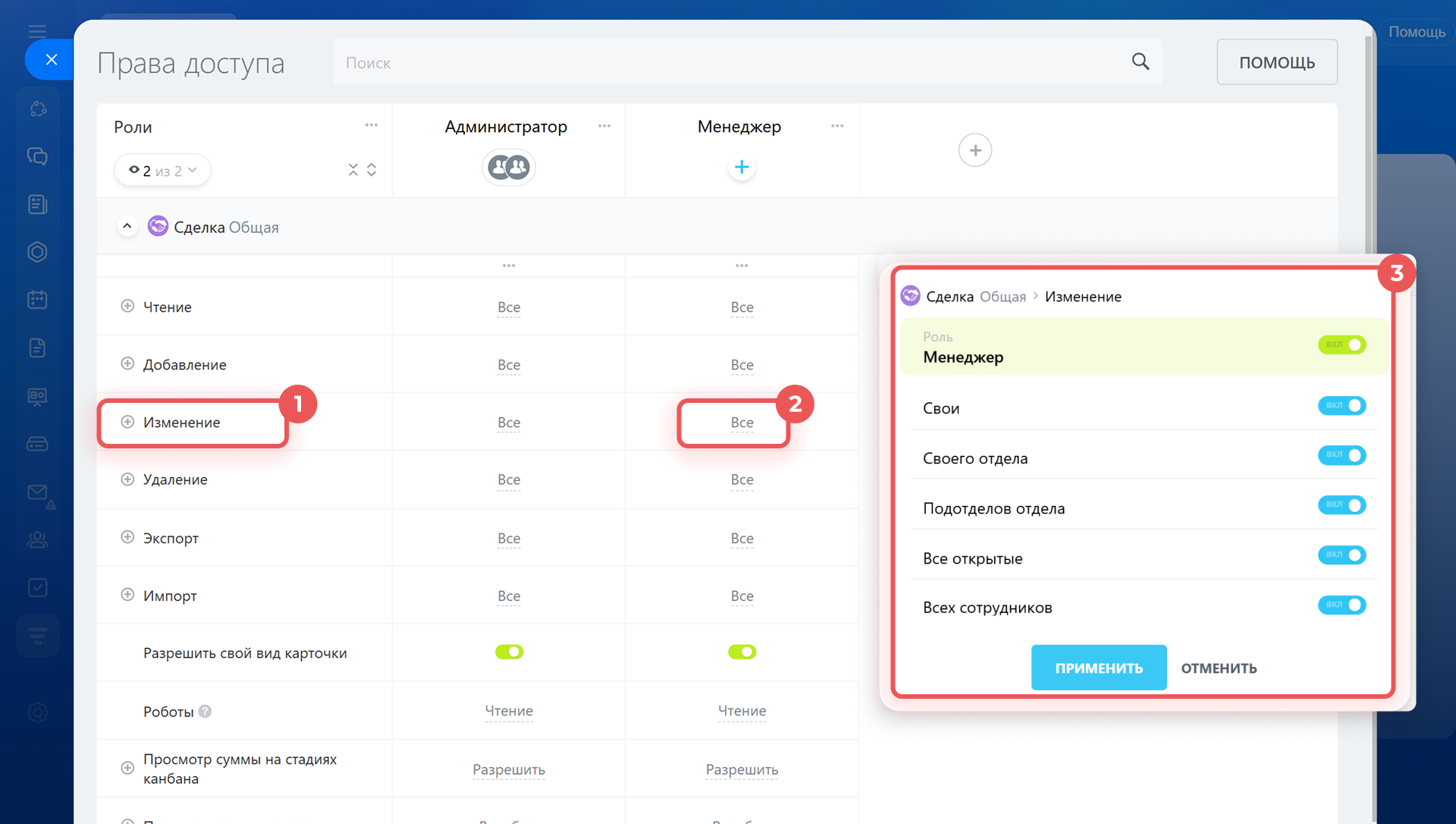2. Выдайте сотруднику права доступа на изменение элемента CRM. Например, чтобы обработать звонок в сделке, должны быть права на изменение сделок.