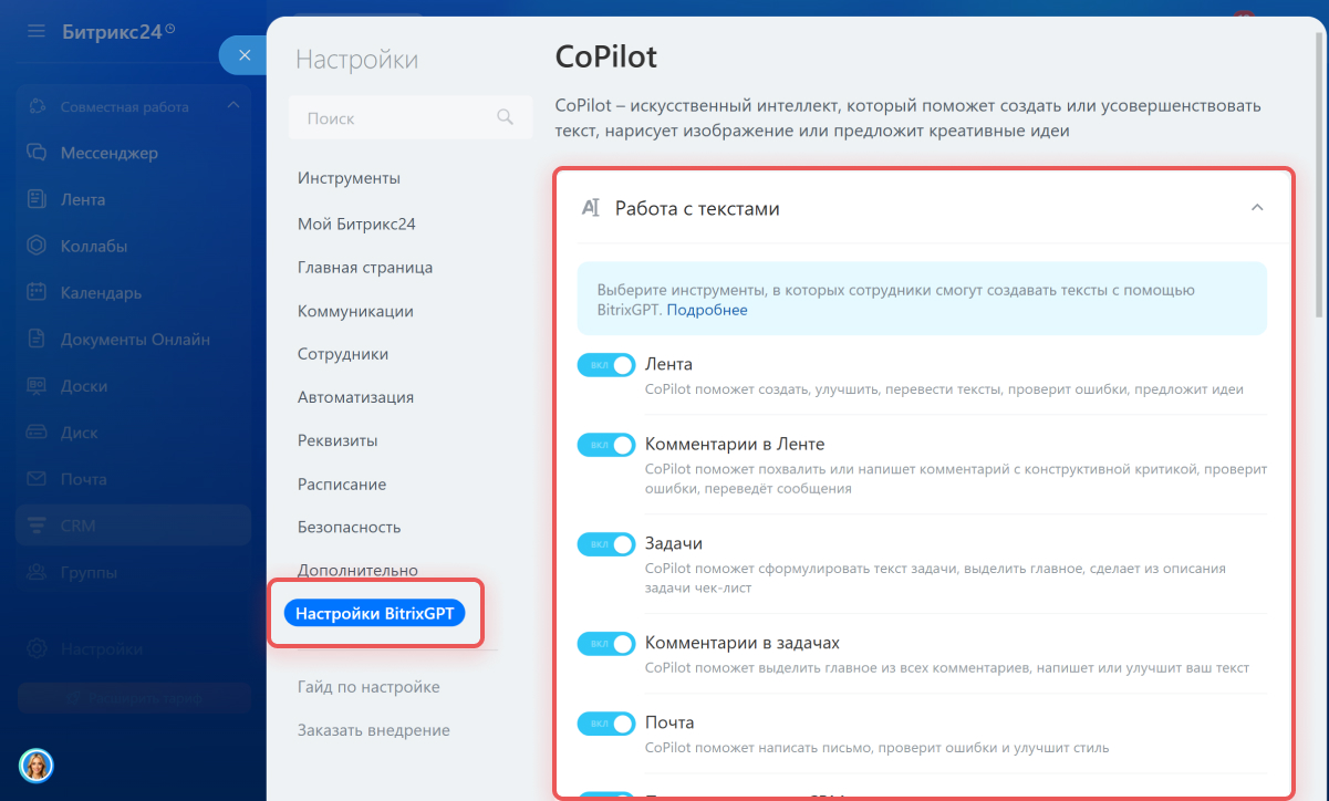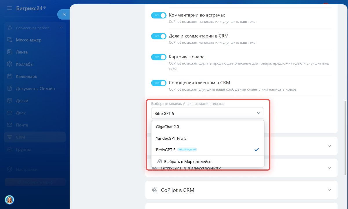 Вы можете в любой момент сменить модель AI в настройках Битрикс24 или отключить отдельные сценарии использования BitrixGPT.