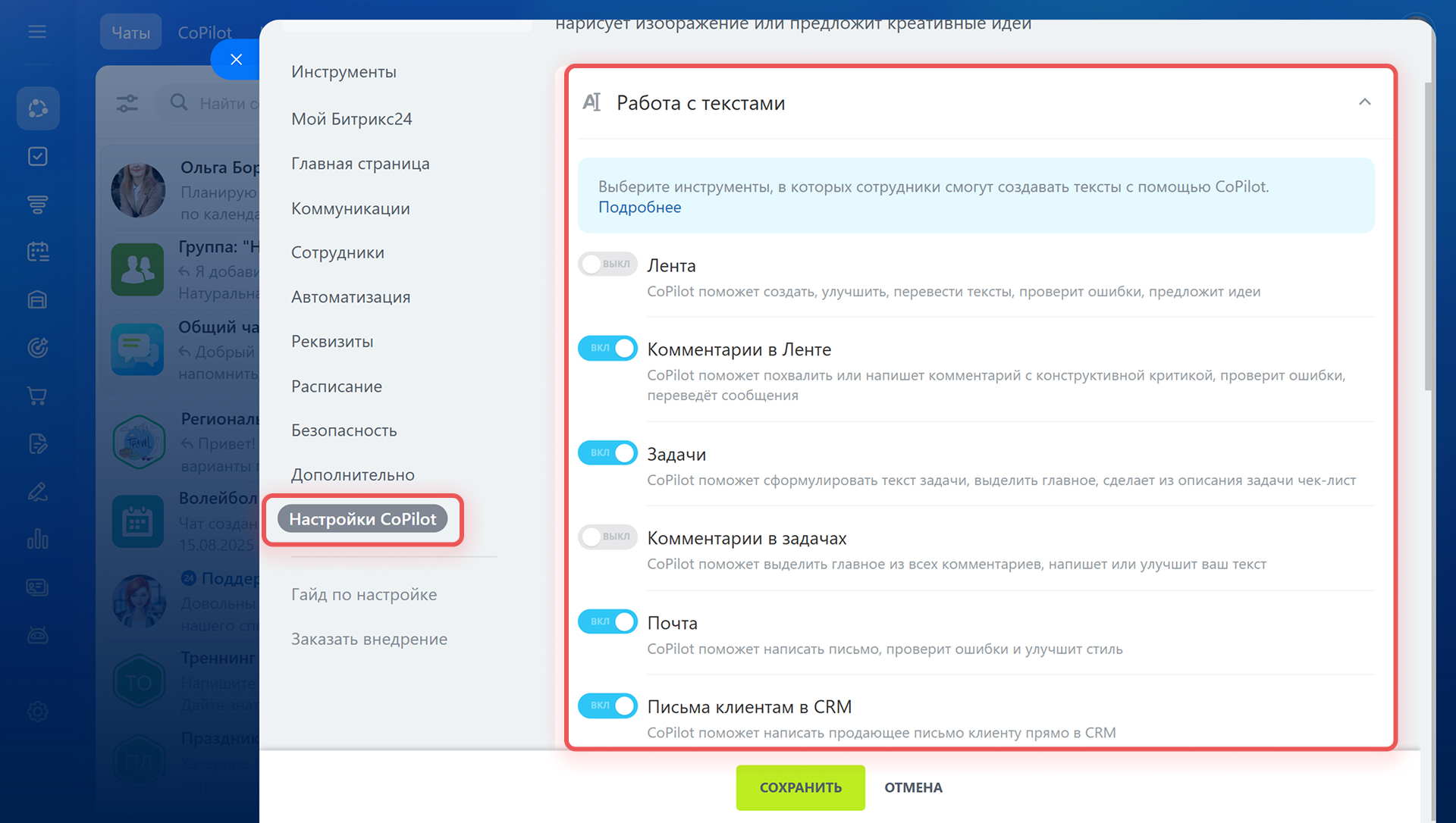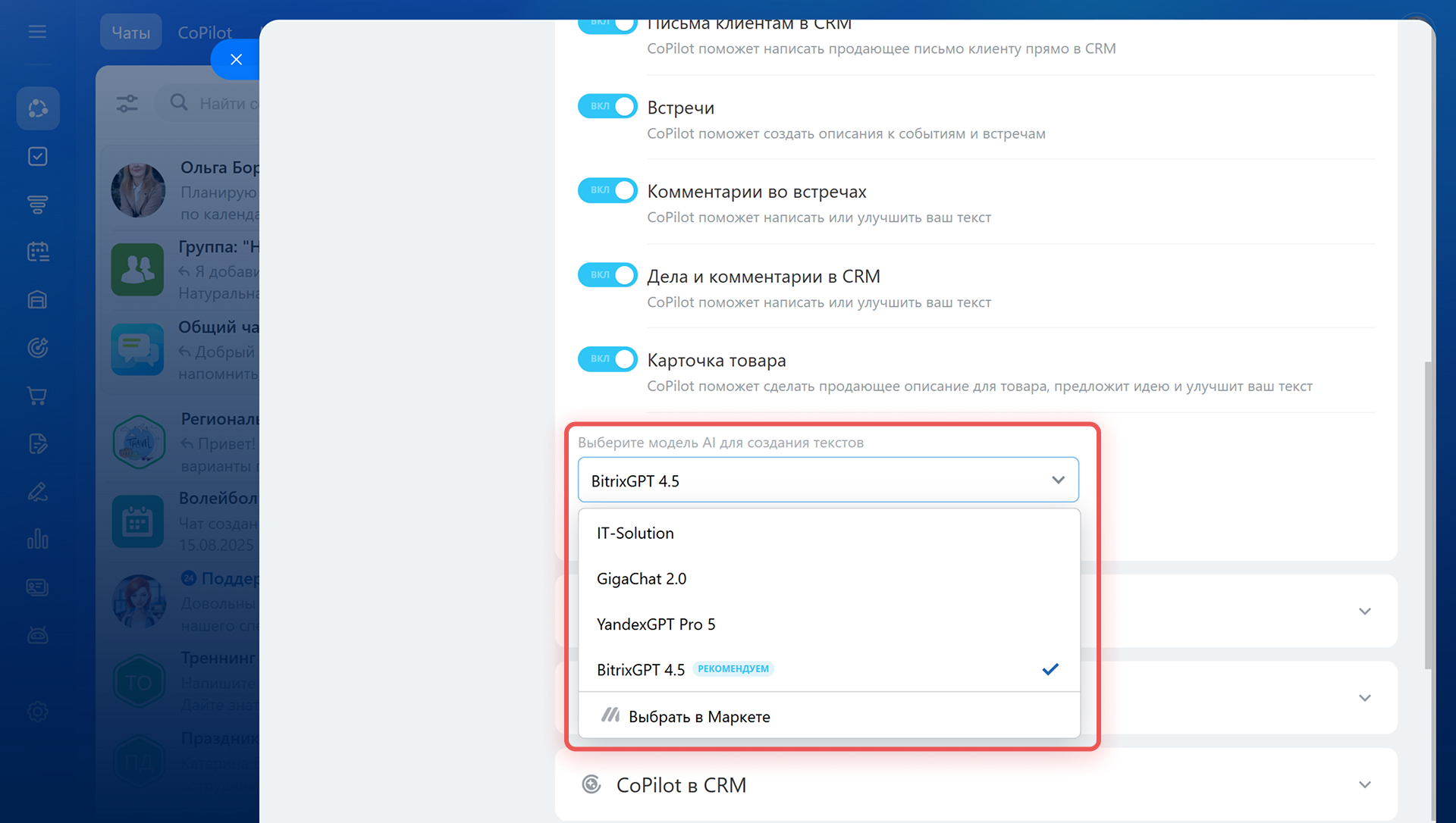 Вы можете в любой момент сменить модель AI в настройках Битрикс24 или отключить отдельные сценарии использования CoPilot.