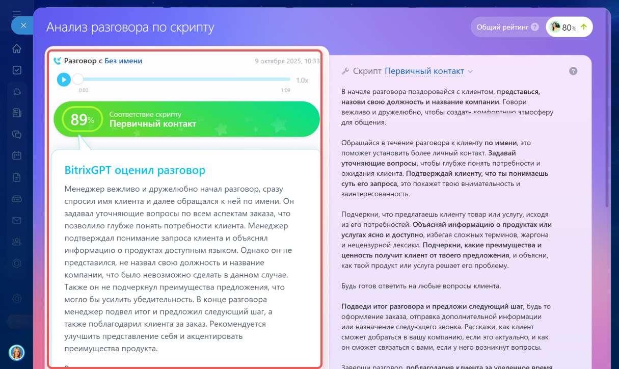• Сценарий BitrixGPT Скрипты продаж и речевая аналитика с AI поможет проанализировать разговор менеджера с клиентом на соответствие скрипту и подскажет, что можно улучшить.