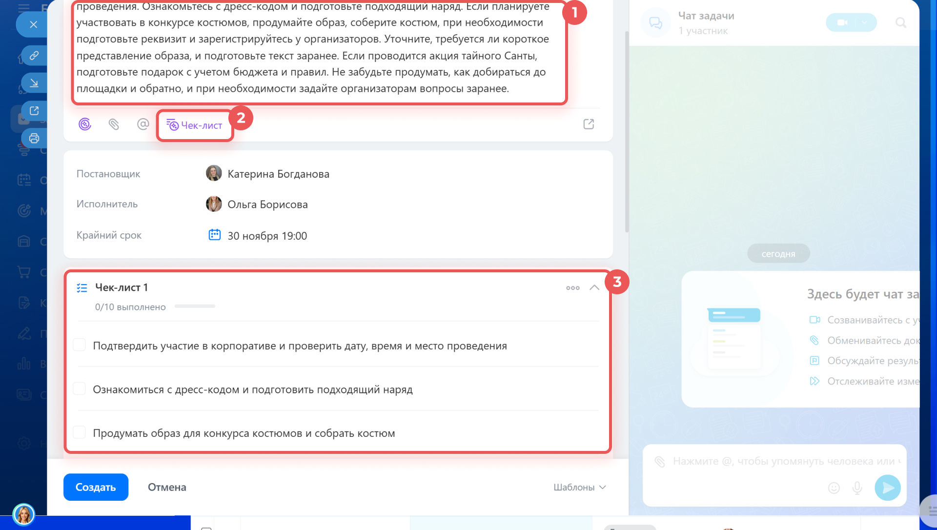 • поставит задачу и добавит в нее чек-лист.