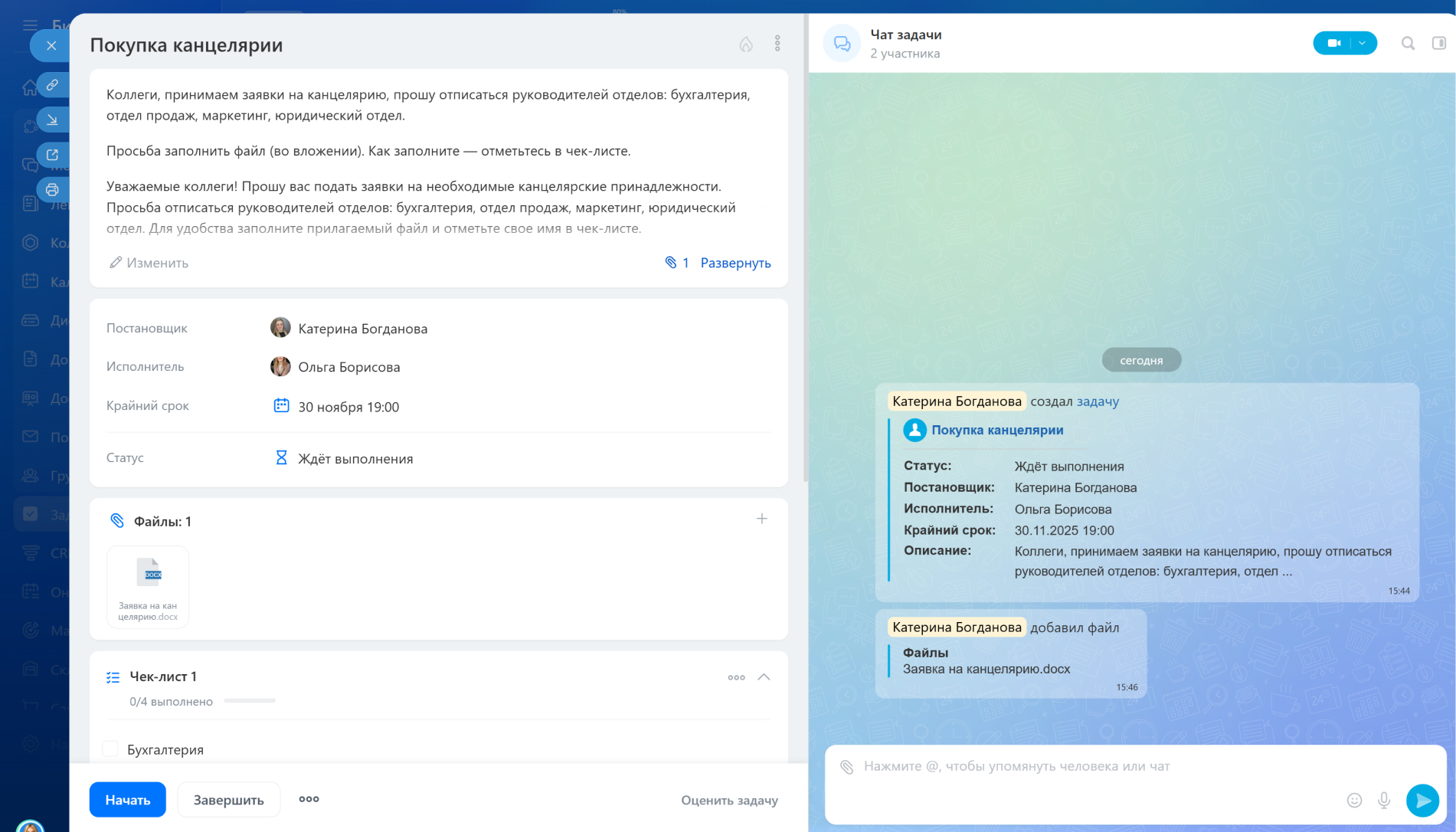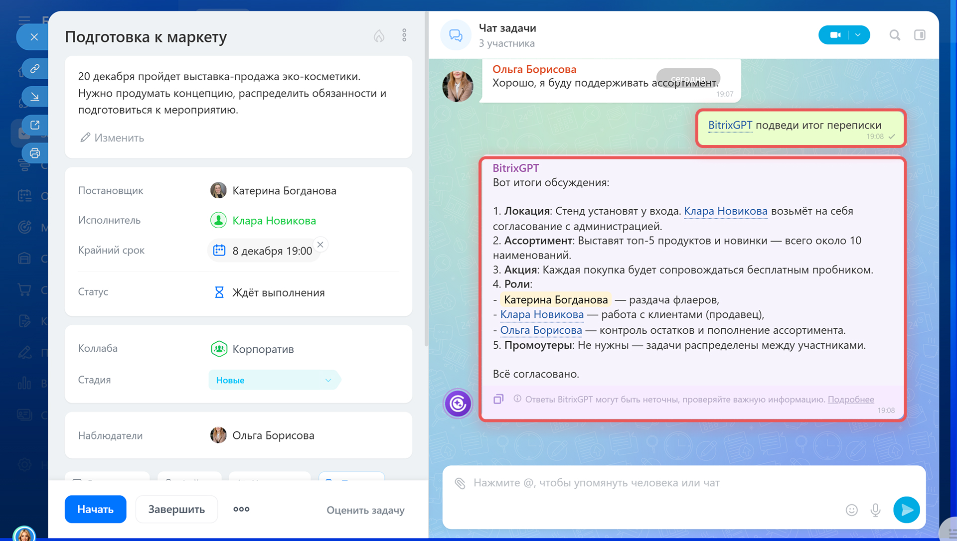 BitrixGPT ответит прямо в чате — его ответ увидят все участники задачи.