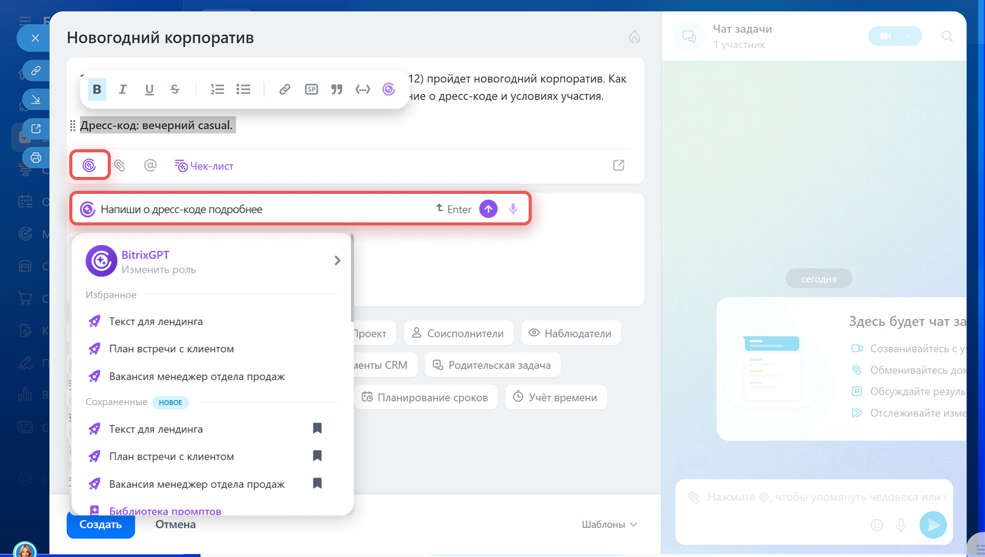 - Чтобы пользоваться BitrixGPT, не надо уметь писать запросы к нейросети: мы заранее подготовили препромпты, чтобы вы могли быстро создать задачу или ответить на комментарии к ней.