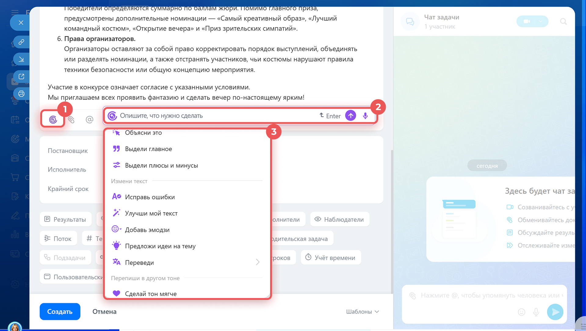Укажите основную информацию в задаче, а BitrixGPT добавит детали. За сложными формулировками и опечатками можно не следить — BitrixGPT исправит их за вас. Нажмите на значок