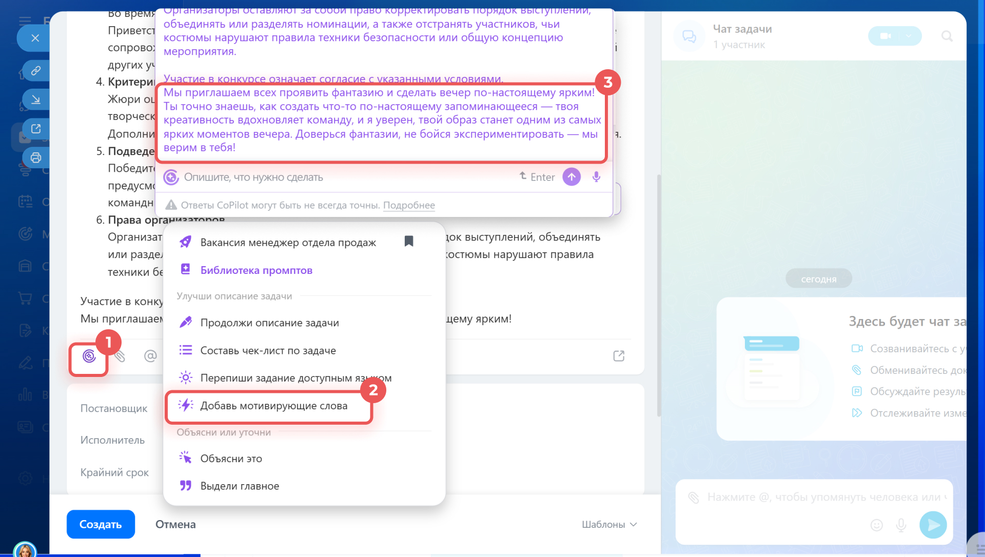 Улучшить описание задачи. BitrixGPT дополнит описание задачи деталями, сделает текст проще и понятнее, составит чек-лист, добавит мотивирующие слова для сотрудников.