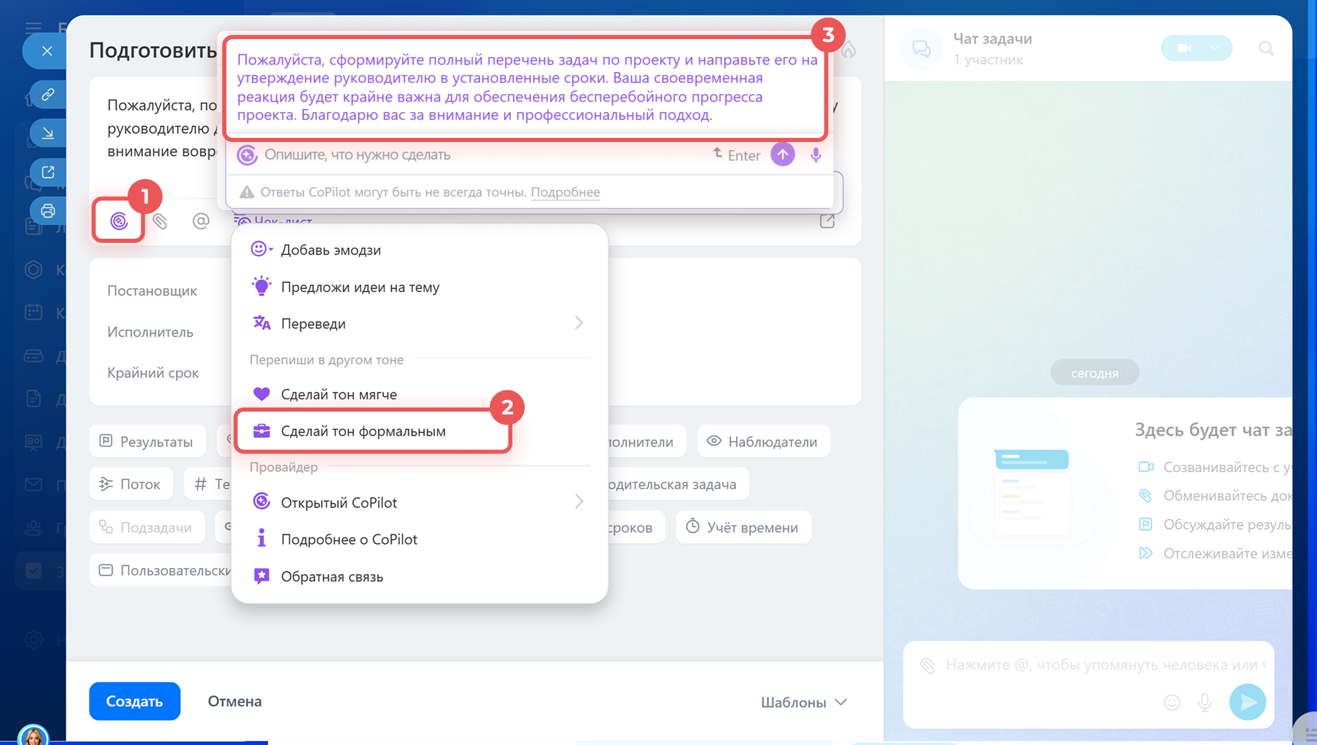 В чате задачи вы можете обратиться к BitrixGPT: задать вопрос, обсудить идею или попросить подвести итоги переписки. AI поможет быстро разобраться, о чем идет речь, предложит идеи и поддержит обсуждение прямо в чате.