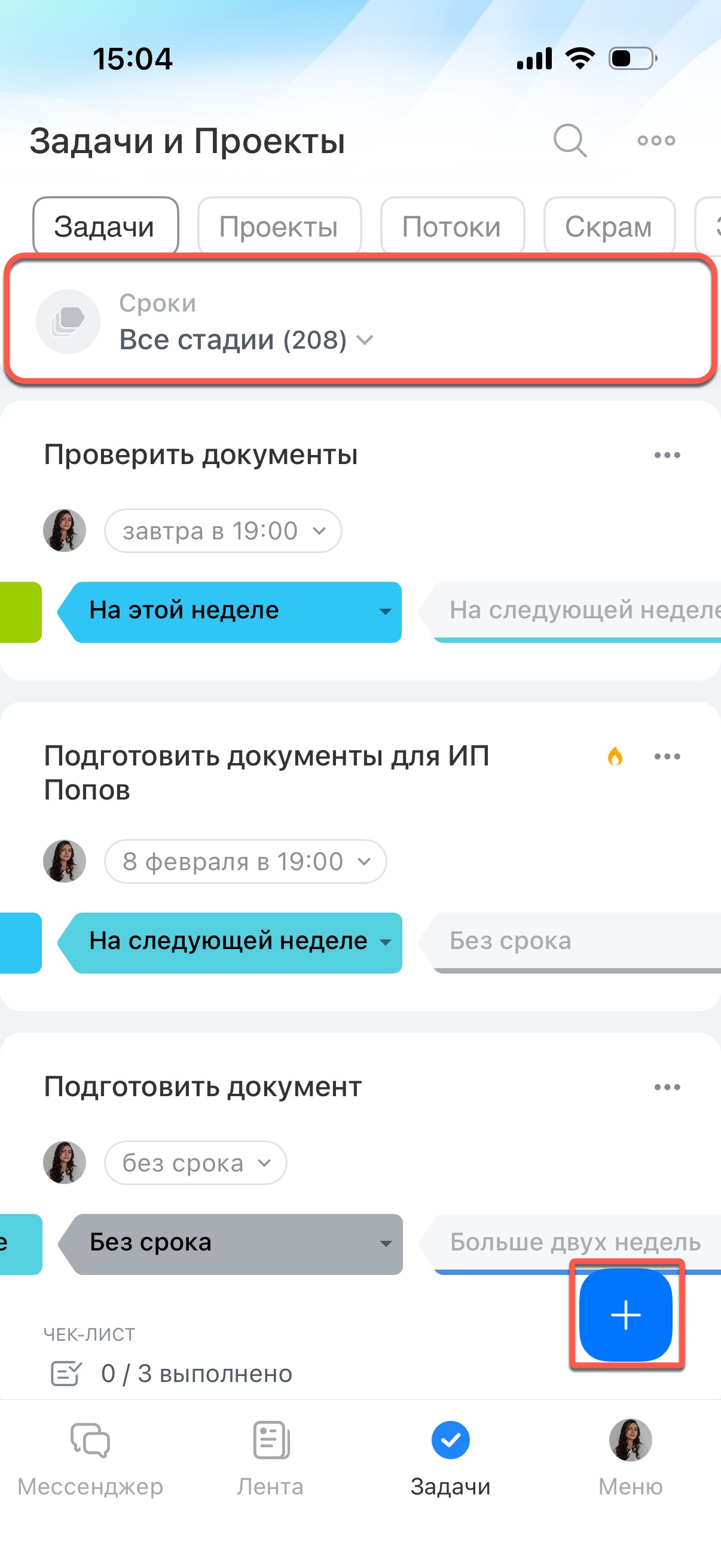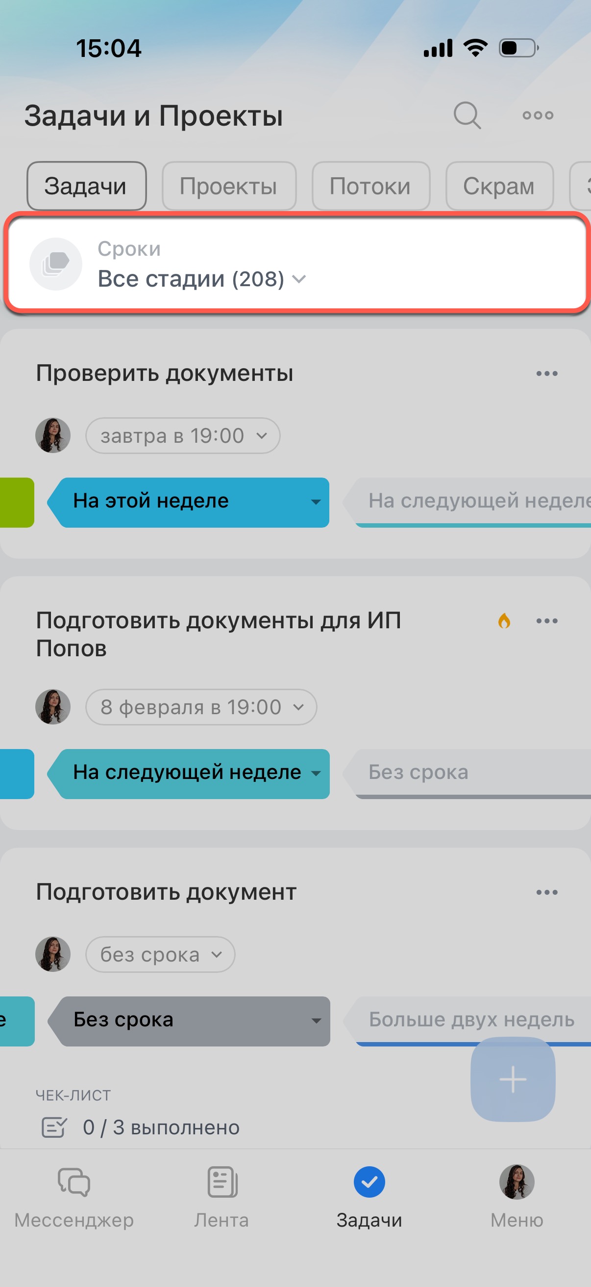 Выберите задачу и нажмите на стадию.