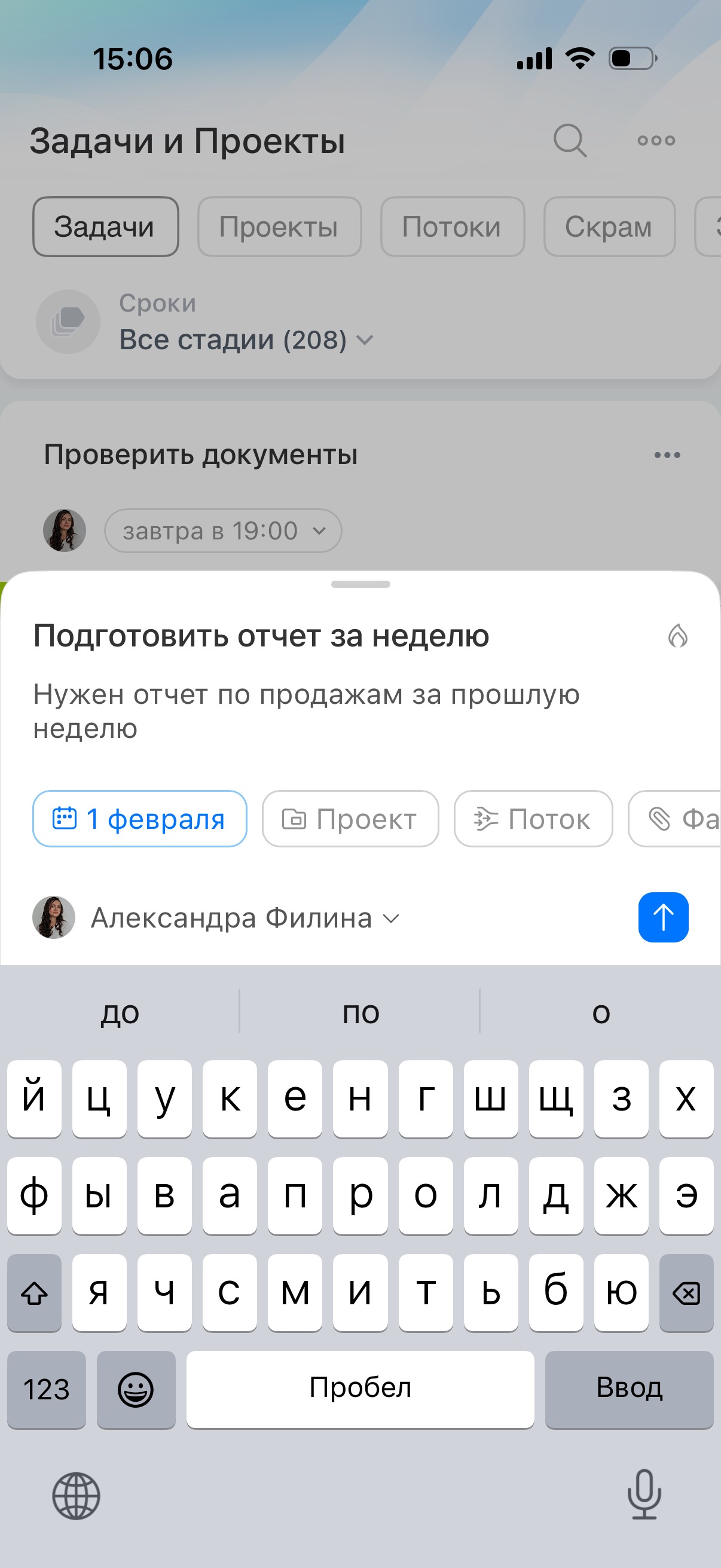 Введите название задачи и заполните поля. Крайний срок задачи по умолчанию будет установлен на неделю вперед от даты создания. Вы можете указать другой дедлайн, и задача автоматически переместится на стадию, соответствующую этому сроку.