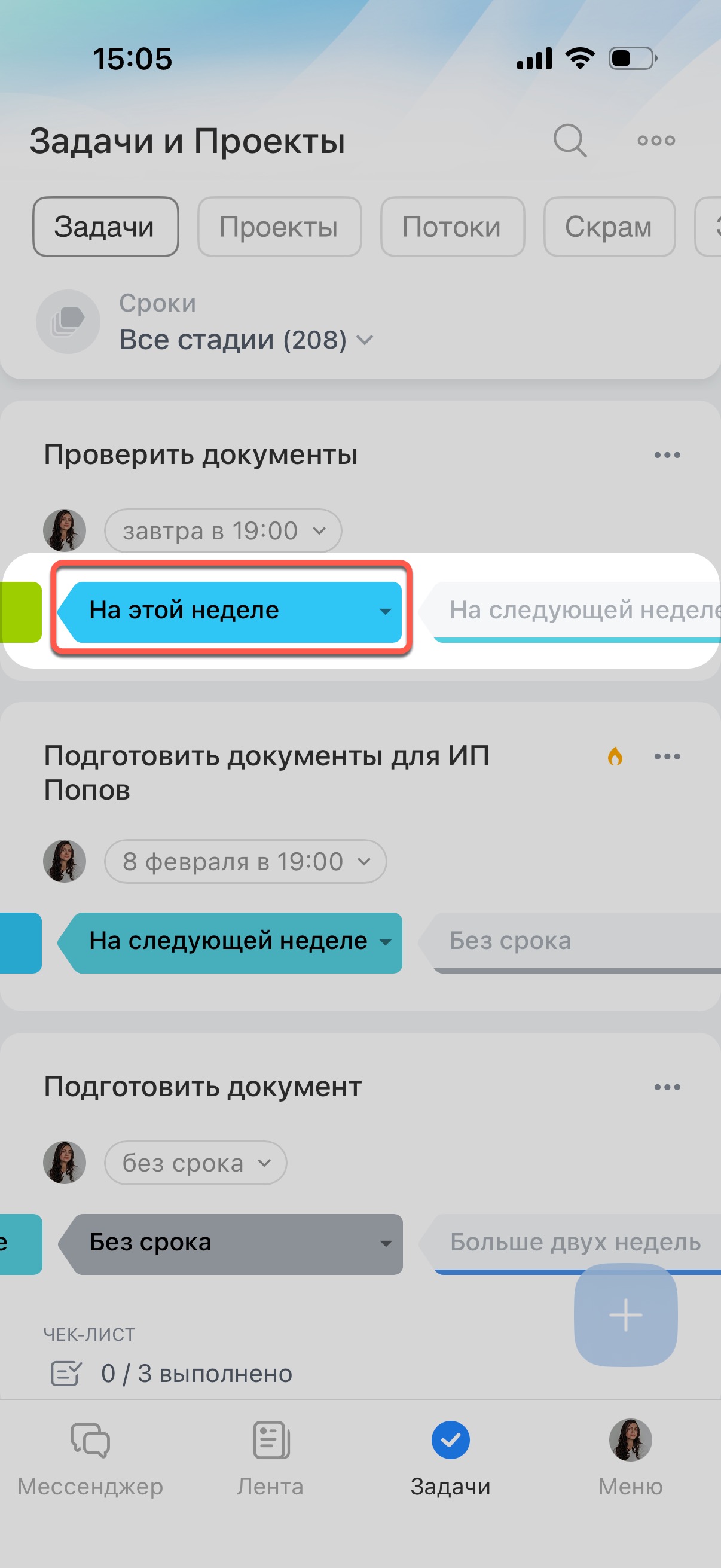 Если перенести задачу на стадию На следующей неделе или Больше двух недель, в задаче будет выставлен новый крайний срок — последний рабочий день недели. Какой рабочий день считается последним, зависит от настроек Битрикс24. Если указать режим работы с понедельника по пятницу, это будет пятница. Если вы работаете без выходных — воскресенье.
