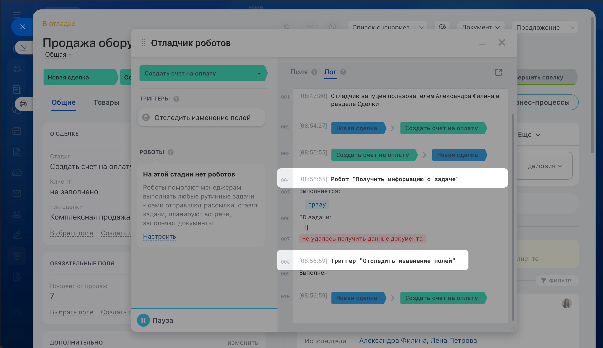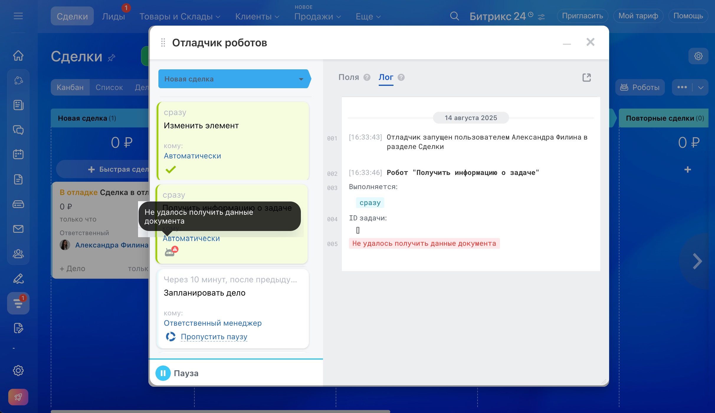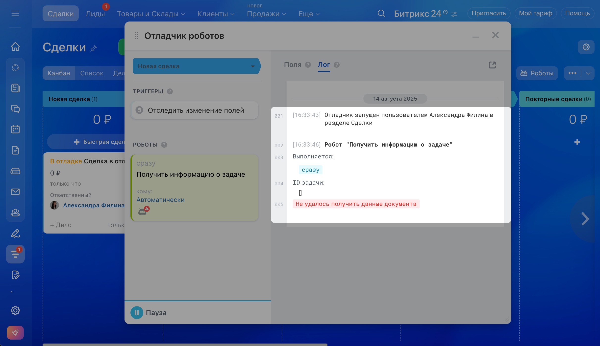 Ошибки. Если робот не сработал из-за ошибки, в логе будет указана причина. Запись отображается на красном фоне.
