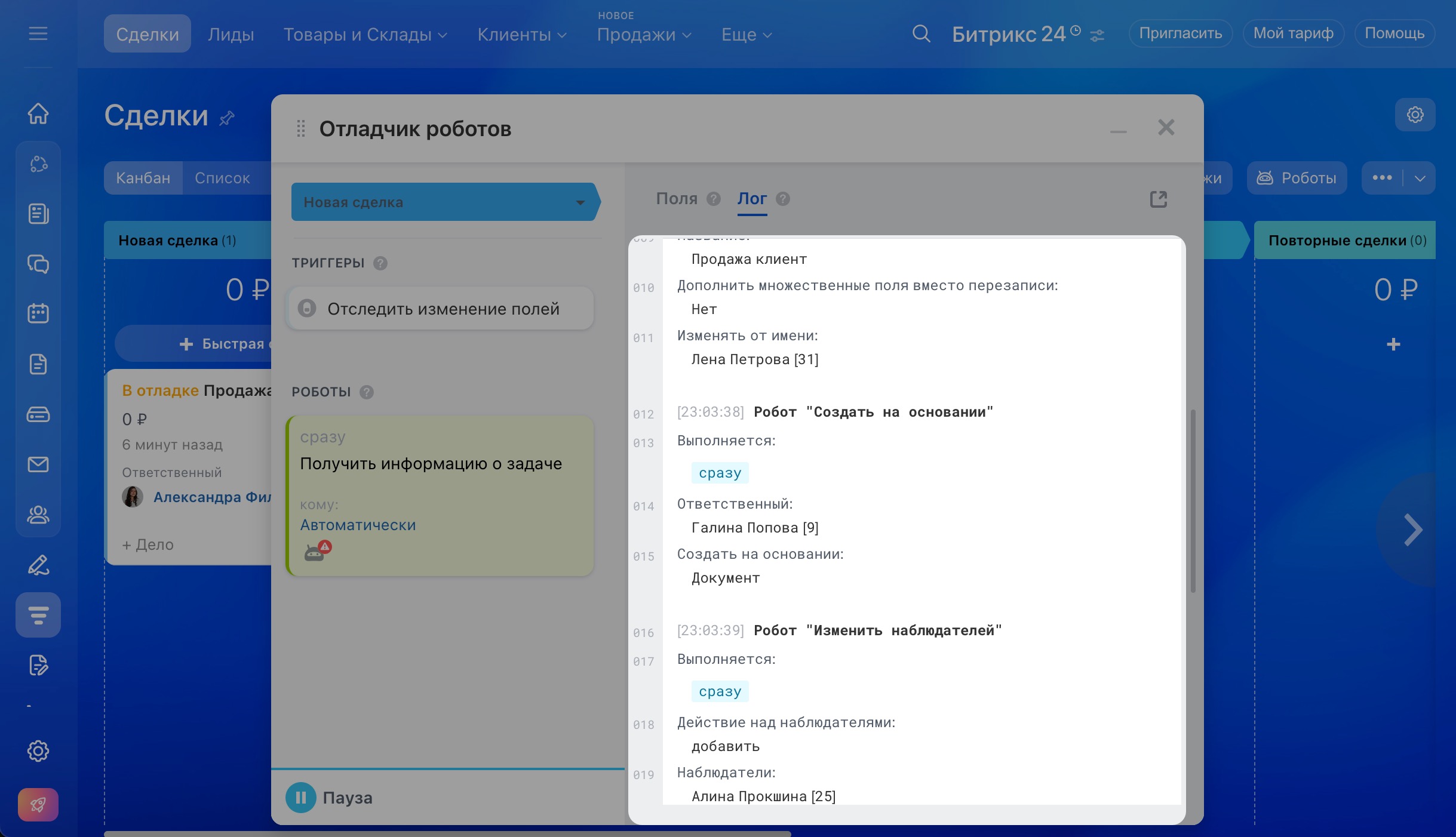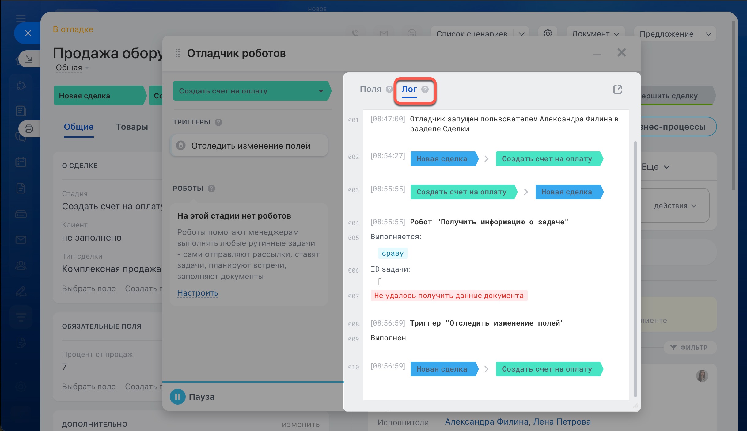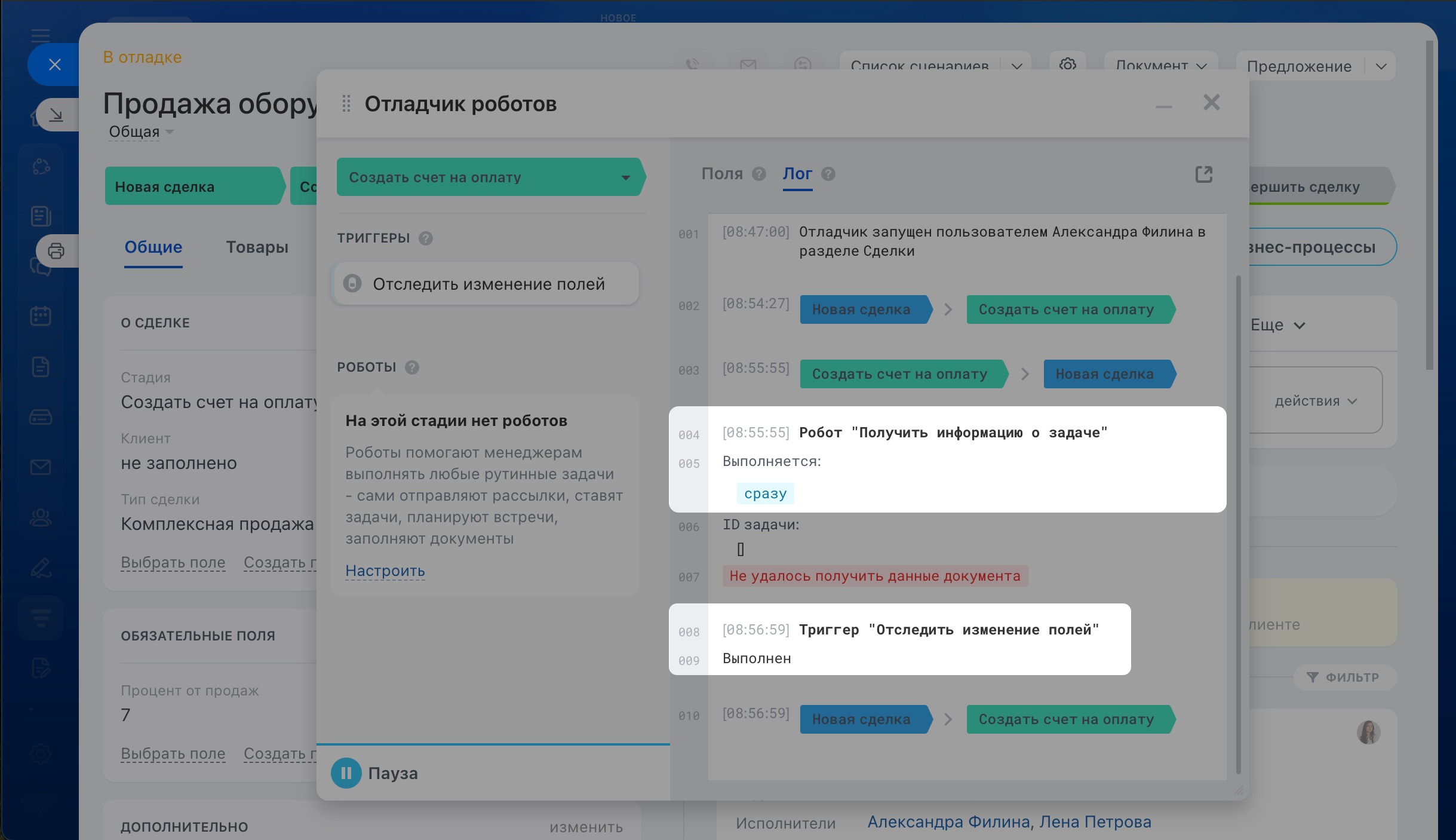 Во время отладки в логе появляются записи о действиях и ошибках, а роботы меняют цвет в зависимости от статуса. Вы сможете сразу исправить ошибки и убедиться, что настроили роботов правильно.