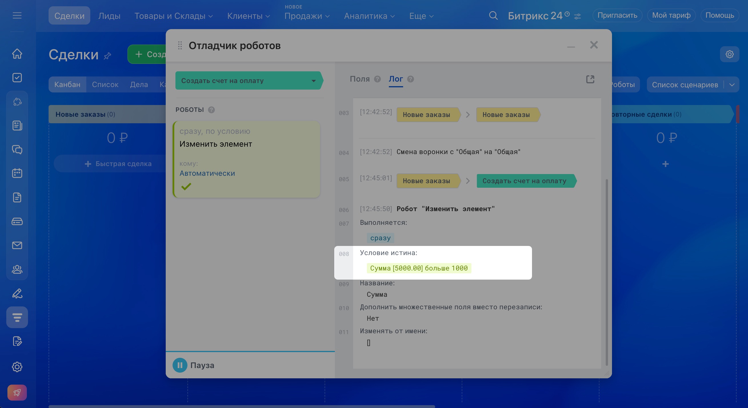 - Робот не сработал — белый цвет без иконок. Перейдите в настройку робота, проверьте условия и последовательность запуска роботов.