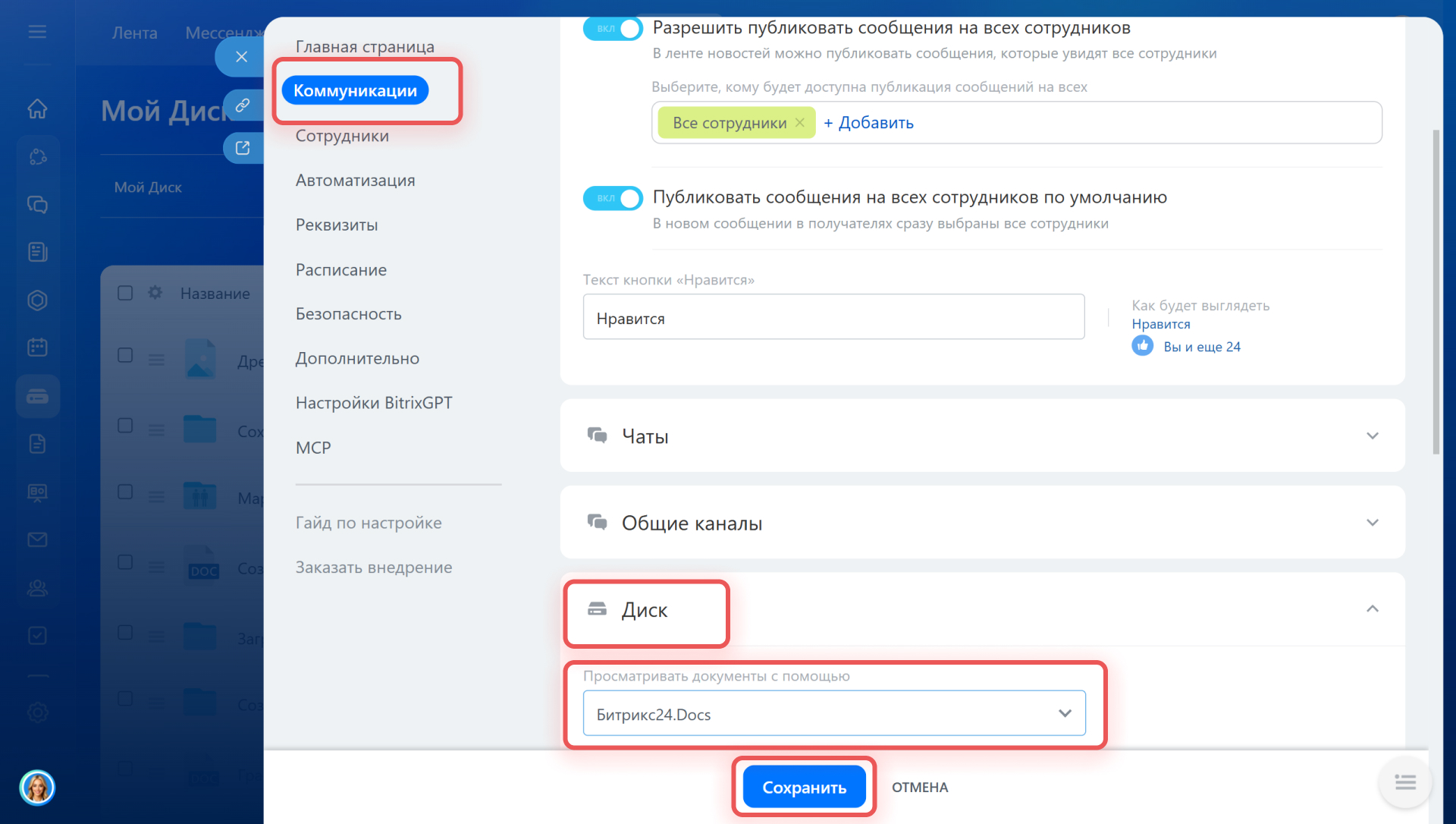 Просматривать файлы можно с помощью встроенного в Битрикс24 инструмента. Для этого администратор должен включить настройку. Перейдите в Настройки > Коммуникации > Диск. Выберите Просматривать документы с помощью > Битрикс24.Docs. Сохраните изменения.