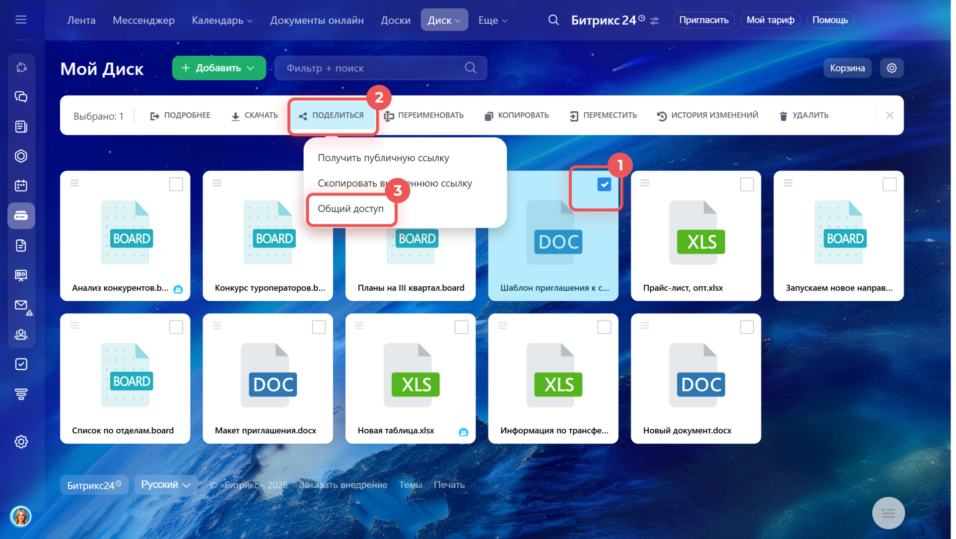 1–3. Выберите нужный документ и нажмите Поделиться > Общий доступ.