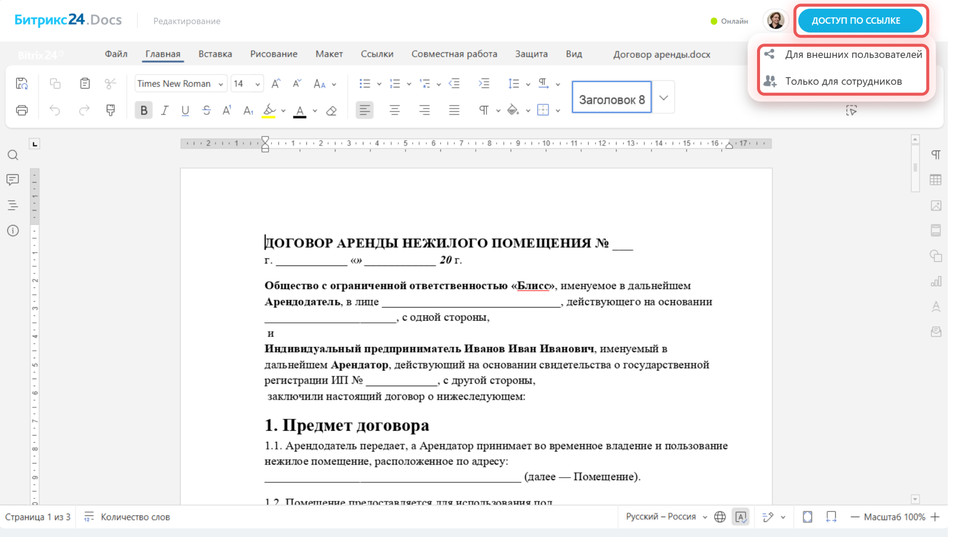 В Битрикс24 можно работать с документом совместно с коллегами или внешними пользователями. Чтобы информация осталась под контролем, настройте для участников разный уровень доступа. Например, разрешите сотрудникам редактировать документы, а клиентам и сторонним экспертам — просматривать их.