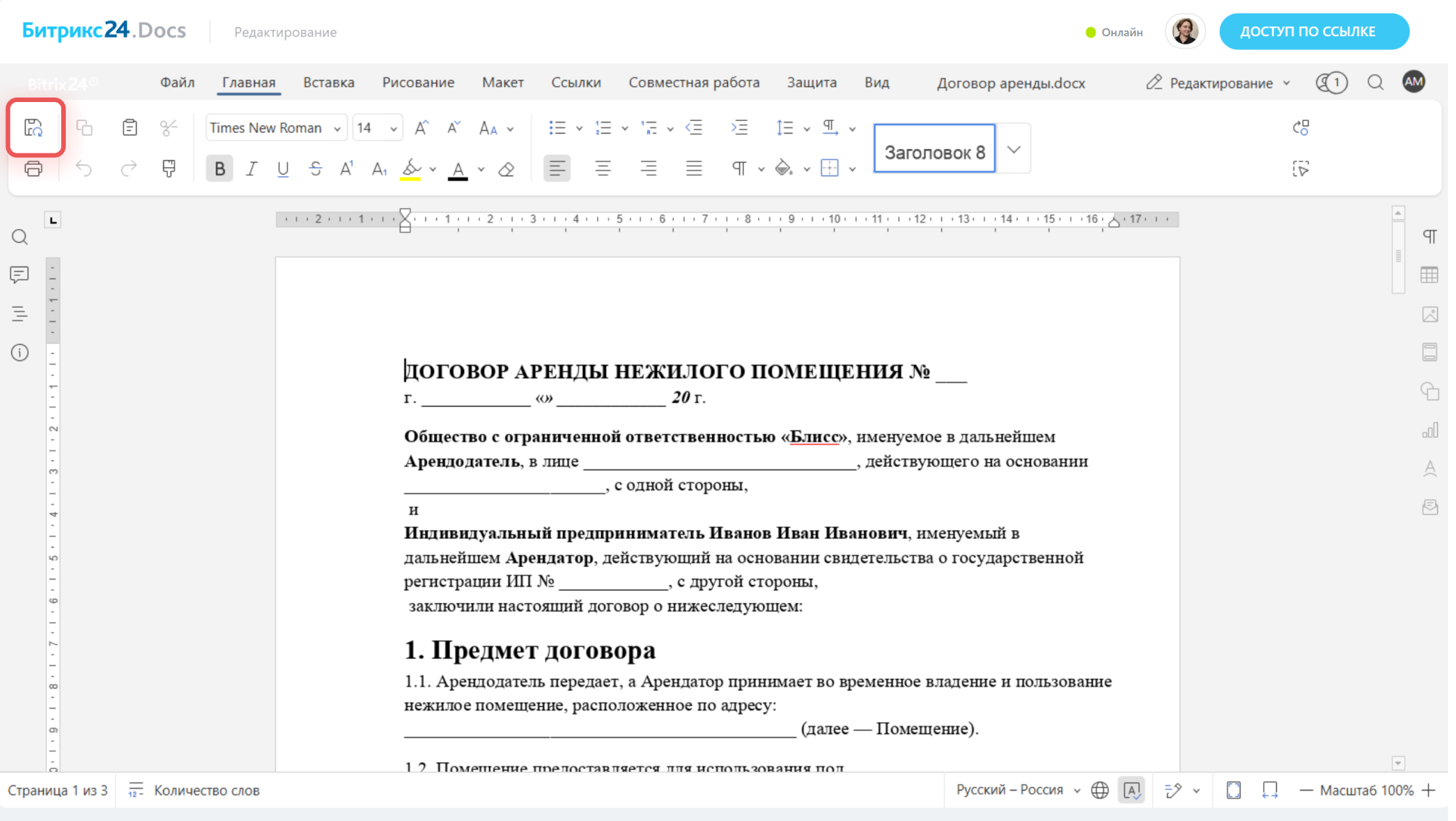 Нажмите на кнопку Сохранить или просто закройте документ. Изменения в Битрикс24.Docs сохранятся автоматически.