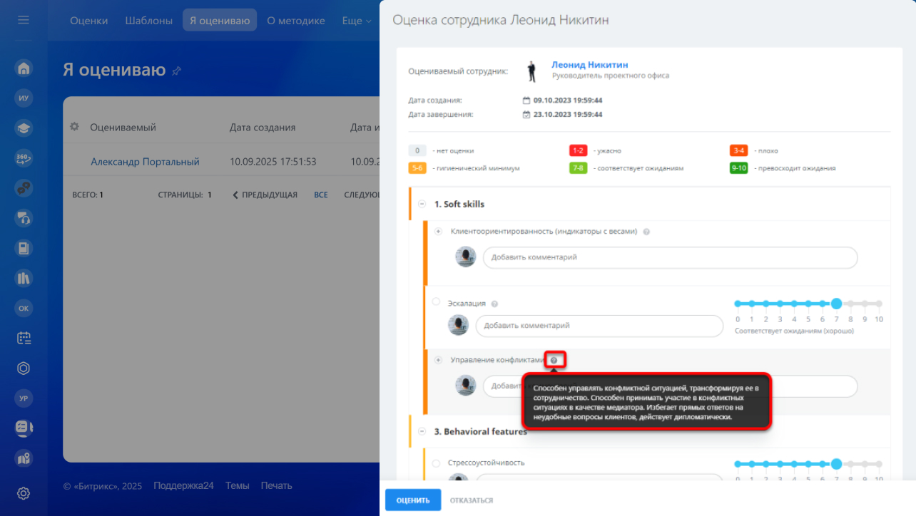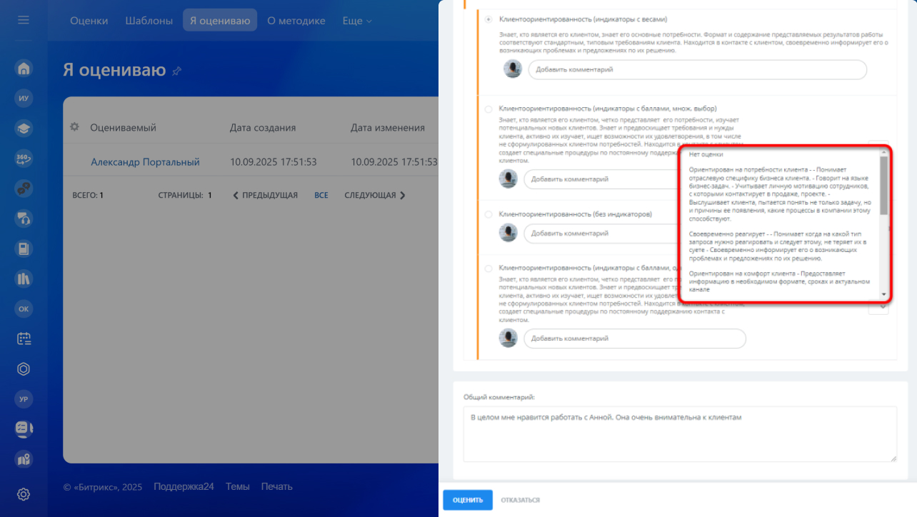 Обязательность поля Комментарий для незаполненных компетенций. Если вы не можете оценить компетенцию или поставили оценку 0, то надо обязательно написать комментарий. Например, «Не могу оценить, так как не было ситуаций для применения компетенции».