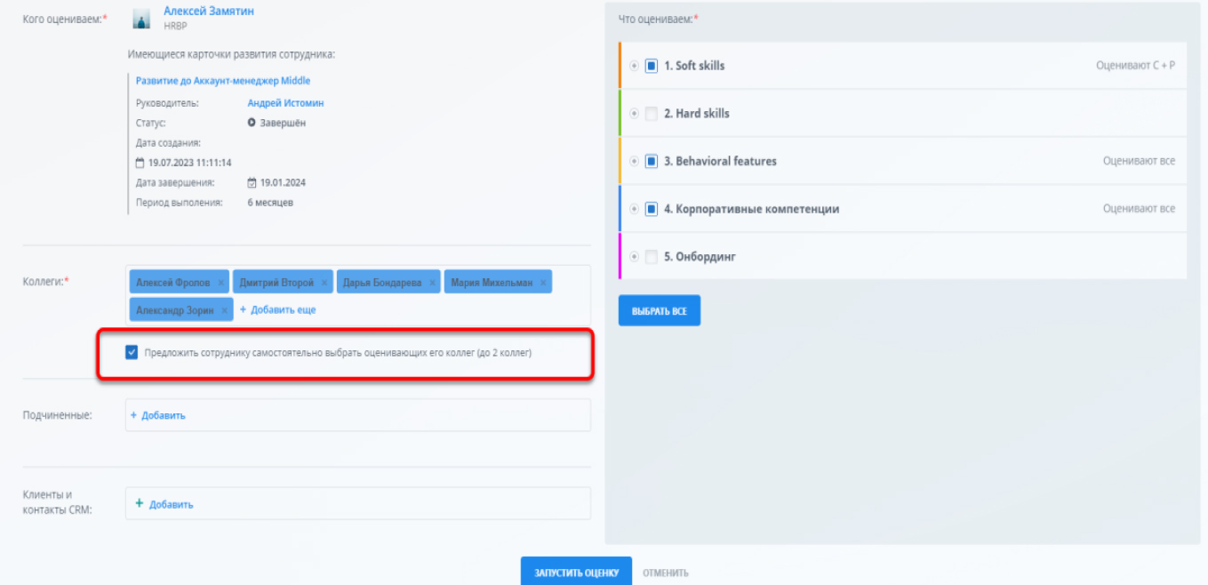 Обязательность привлечения коллег к оценке при запуске. Нельзя запустить процесс оценки, пока не выберете коллег.