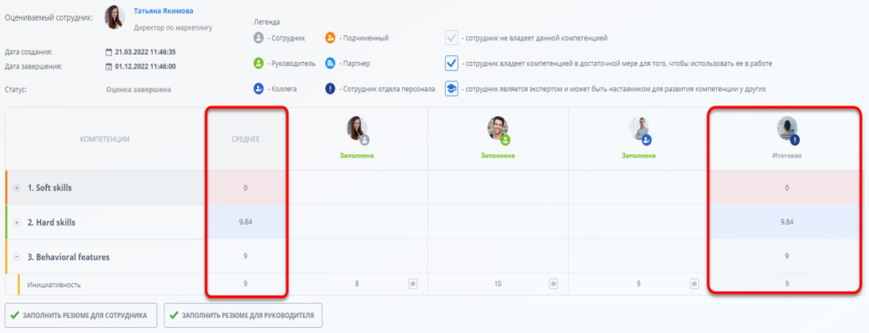 Резюме для сотрудника обязательно для заполнения при завершении процесса оценки. Для завершения процесса оценки HR-специалист обязательно должен заполнить резюме для сотрудника об итогах оценки.