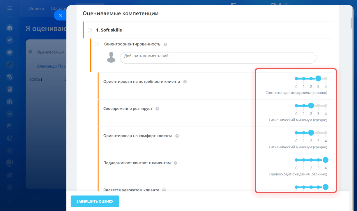 Минимальная оценка, при достижении которой добавляется компетенция в карточку оцениваемого. При достижении этого балла сотруднику будет присвоена компетенция. Это значит, что он может успешно применять ее в работе. После завершения процесса оценки компетенция автоматически добавится в профиль сотрудника в блок Имеющиеся компетенции.