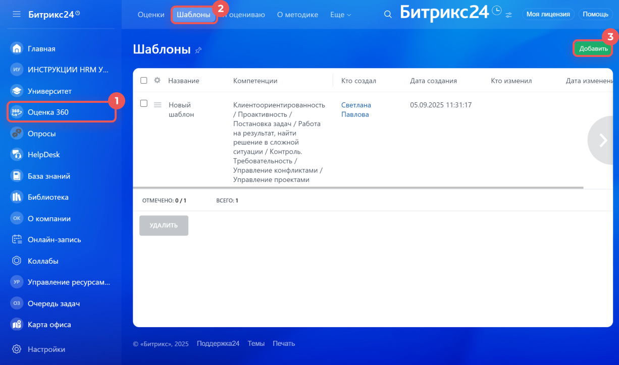 Перейдите в раздел Оценка 360 > Шаблоны и нажмите Добавить.