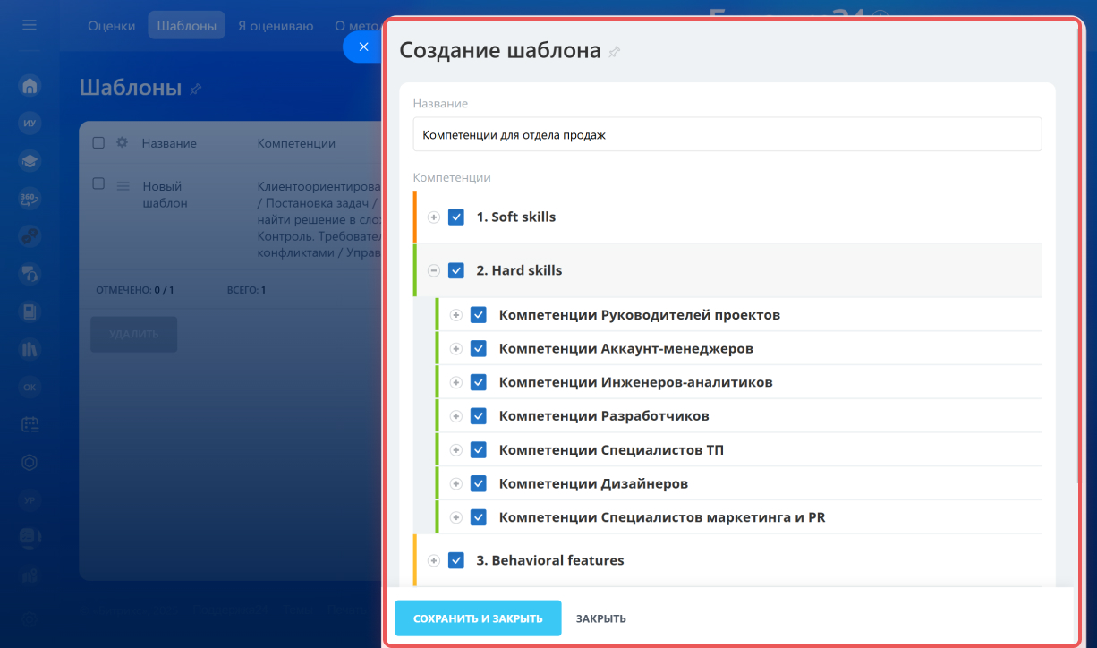 Укажите название шаблона, например Компетенции для отдела продаж. Выберите компетенции, которые надо добавить в шаблон.