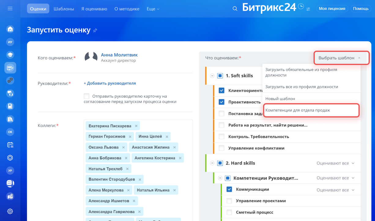 Создайте разные шаблоны компетенций для разных отделов или ролей, это упростит запуск процесса оценки.
