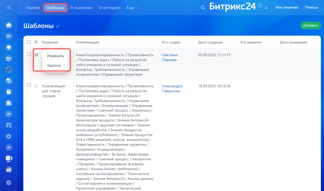 Чтобы отредактировать или удалить шаблон, в списке отметьте нужный и выберите действие.