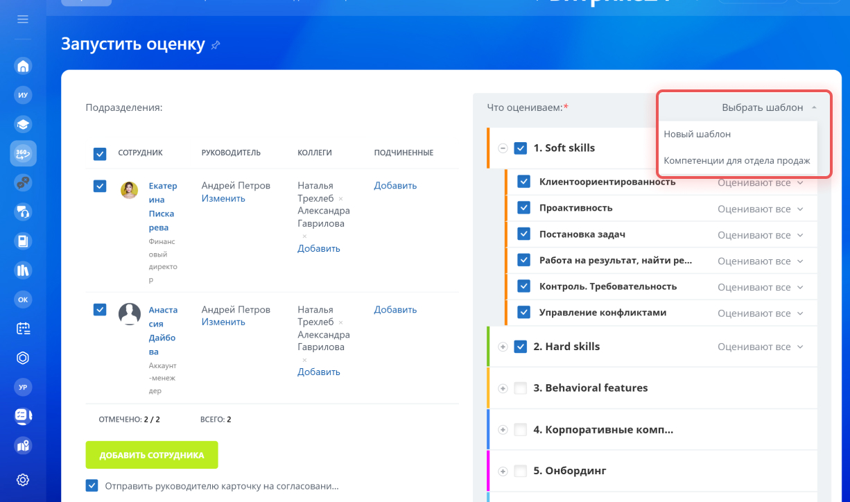 Сотрудник. В карточку оценки автоматически добавляются руководитель и все сотрудники из выбранного отдела. Если кого-то из сотрудников не надо оценивать, снимите галочку напротив его имени.