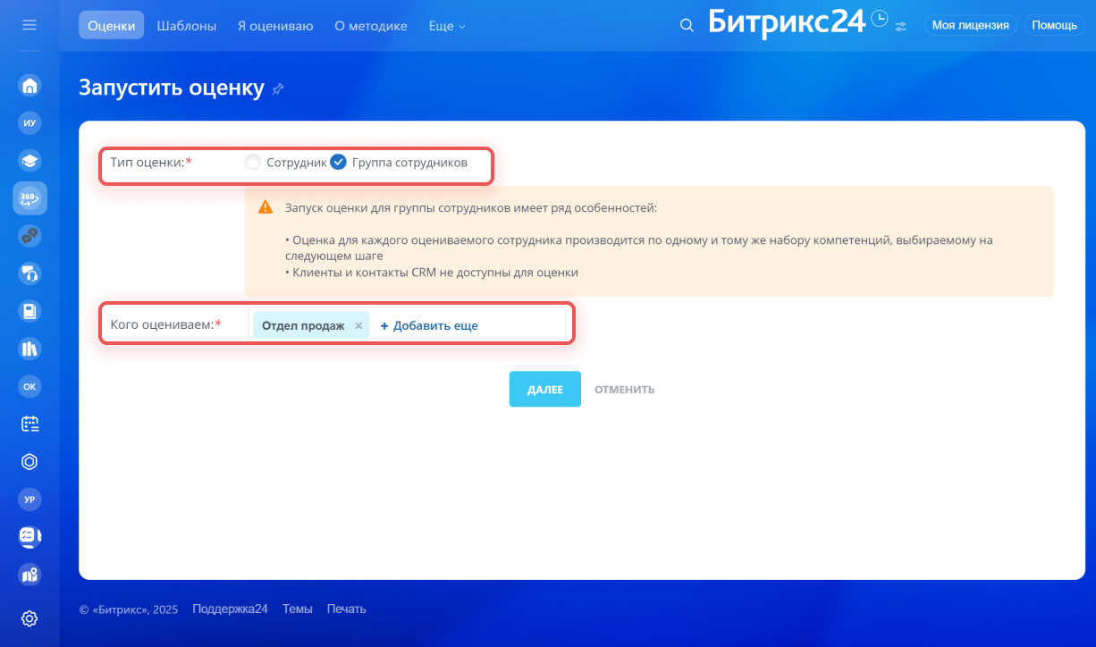 Кого оцениваем. Выберите из списка отдел, для которого надо запустить оценку. Можно выбрать несколько отделов.