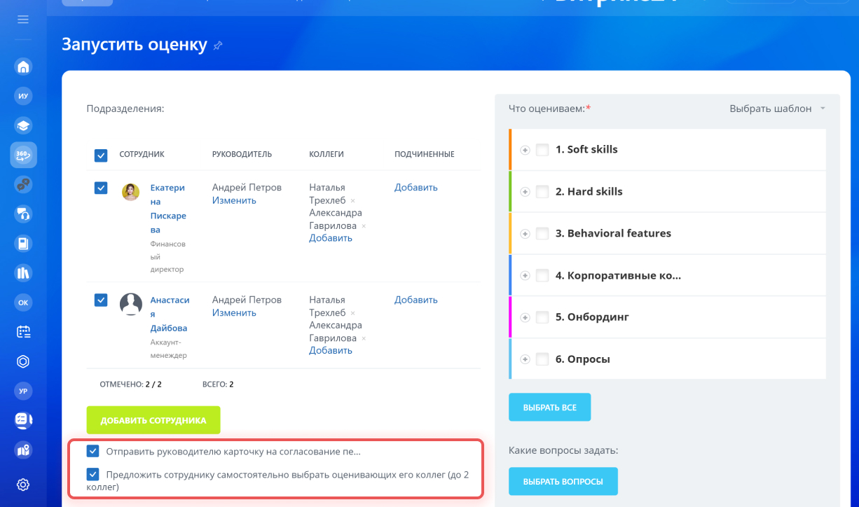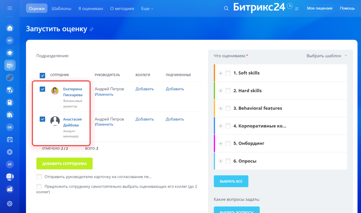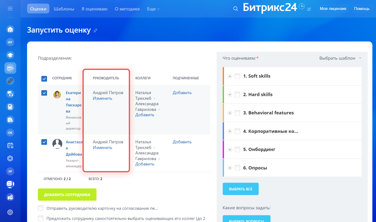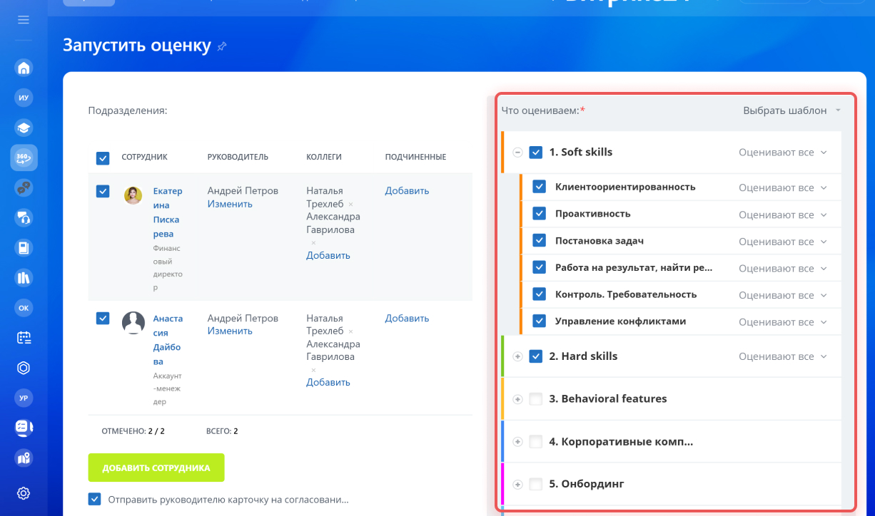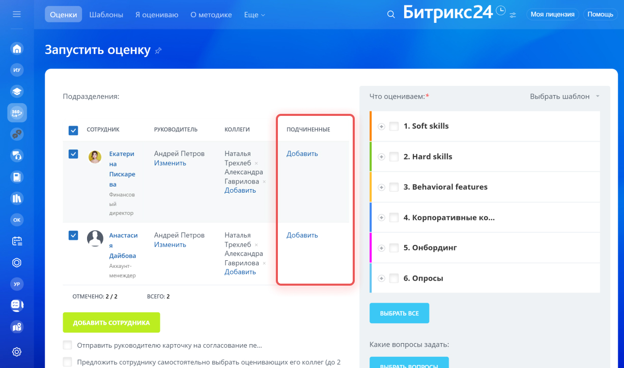 Подчиненные. Если запускаете оценку на руководителя отдела, то в это поле автоматически подставляются подчиненные из структуры компании. Можно вручную добавить сотрудников из других отделов.