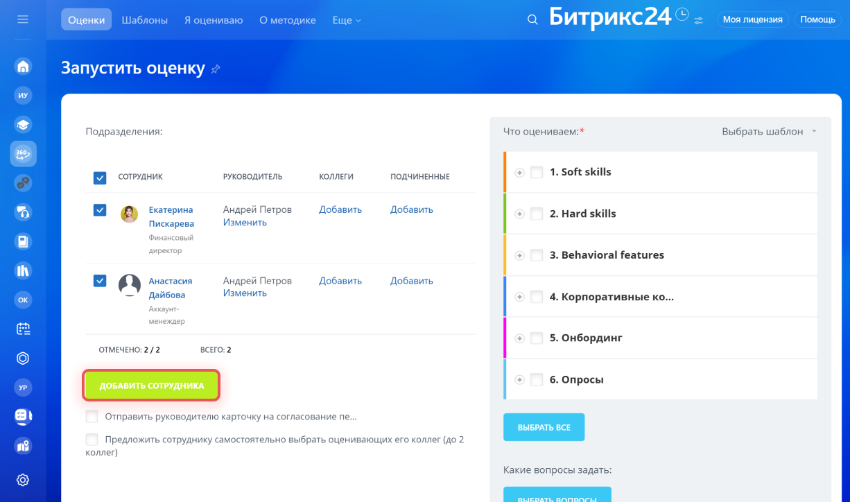 Если надо оценить сотрудника из другого отдела, нажмите Добавить сотрудника.